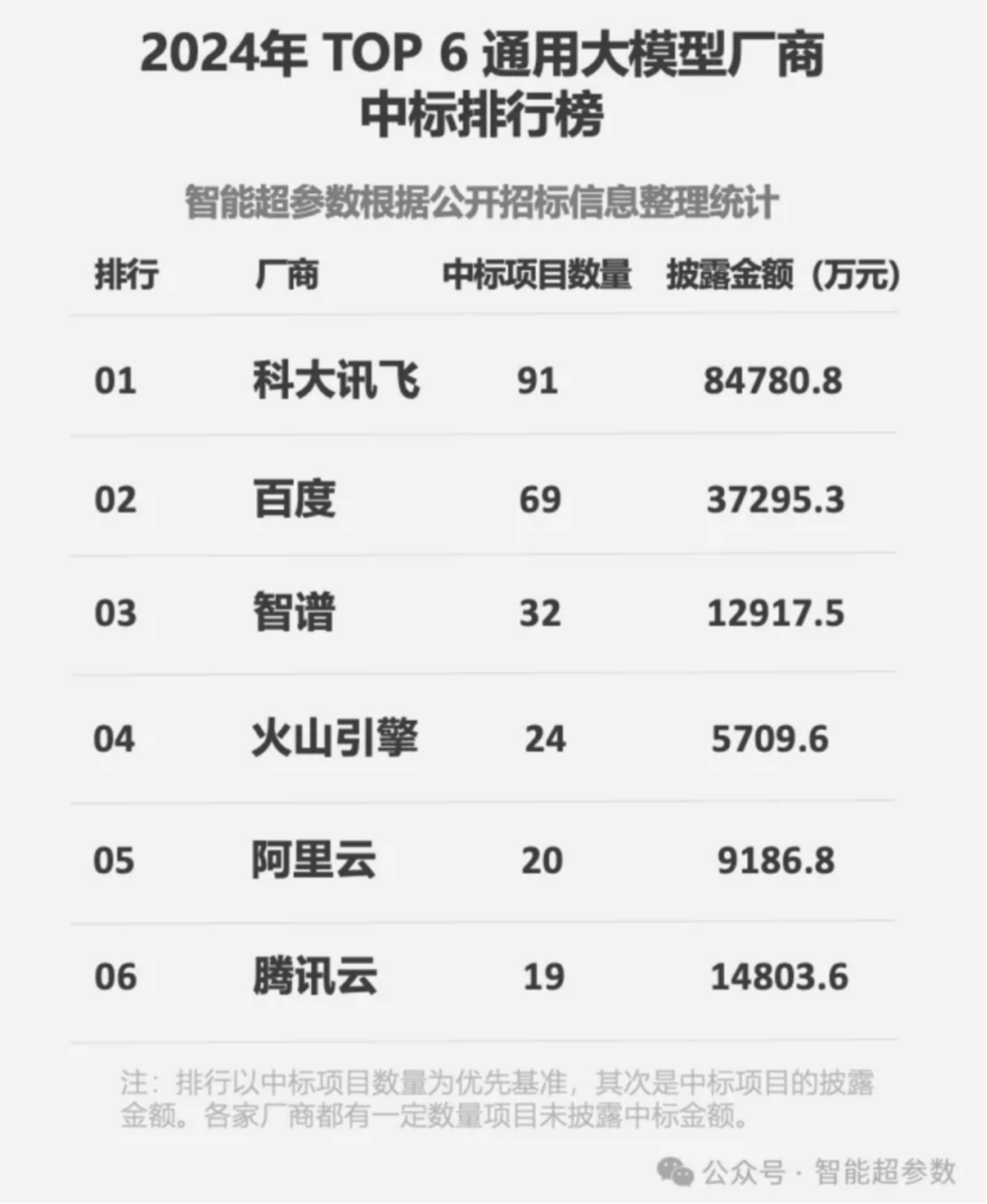 招投标市场的公开信息也佐证着这一点。根据第三方机构智能超参数最新发布的《中国大模型中标项目监测报告(2024)》,2024 年,在通用大模型厂商中标排行榜中,前五名几乎全部来自AI大厂。其中,科大讯飞更是以91个中标项目、披露中标金额84780.8万元排名第一,成为2024年度标王。