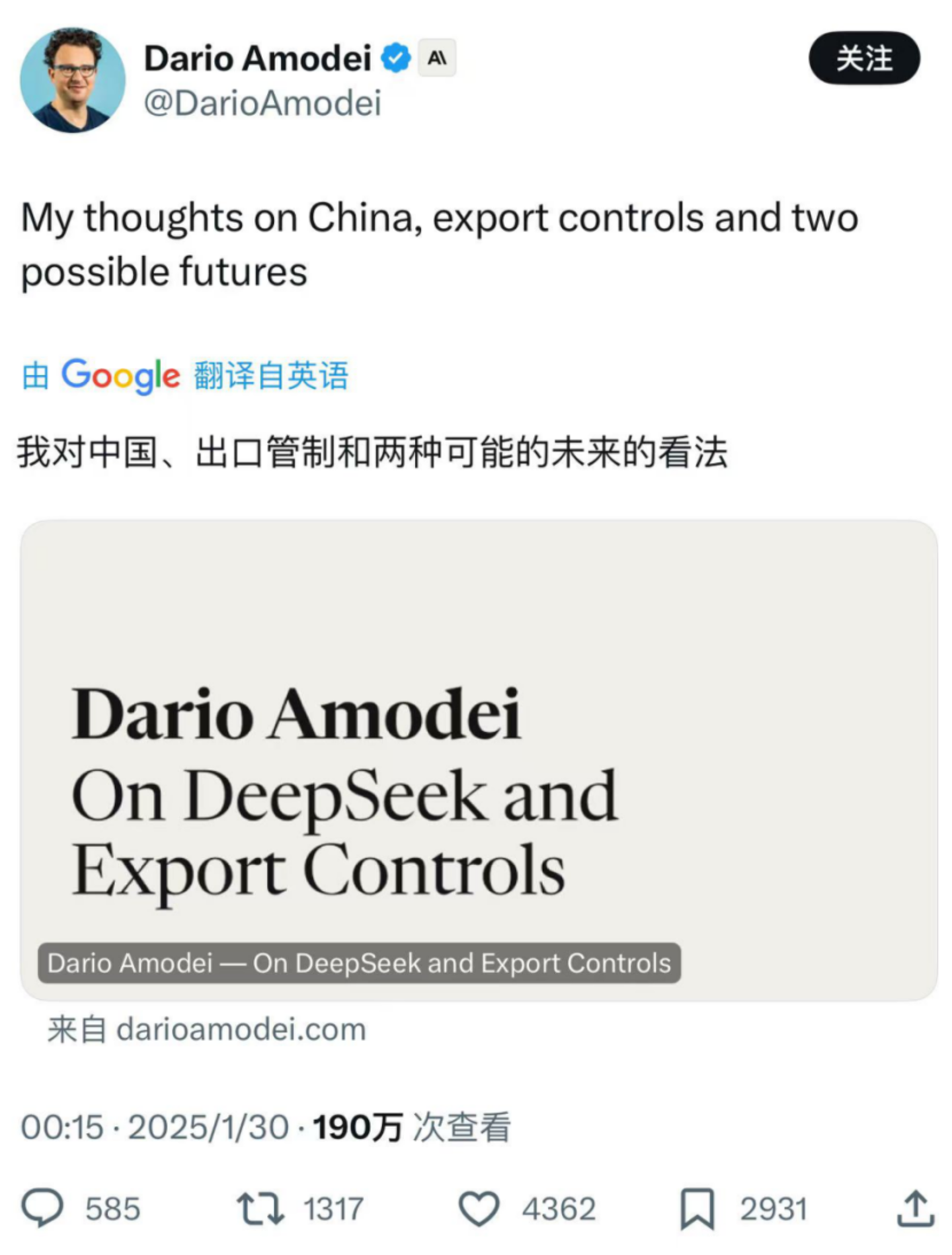 在阿莫迪于1月底发布的万字长文中,其认为DeepSeek的突破,更加印证了美国对华芯片出口管制政策的必要性和紧迫性。