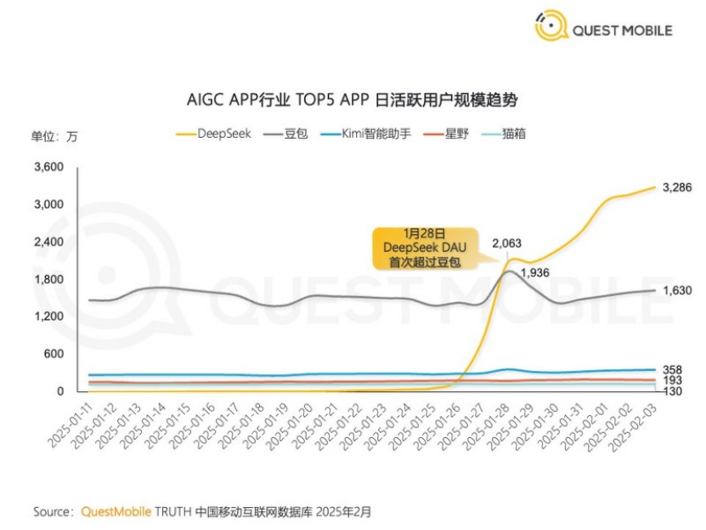 近期,QuestMobile给出的数据显示,DeepSeek日活跃用户(DAU)在1月28日首次超越豆包(约1695万),随后在2月1日突破3000万大关,成为国内DAU最高的AI 对话产品。做到这一切,DeepSeek只用了20天。