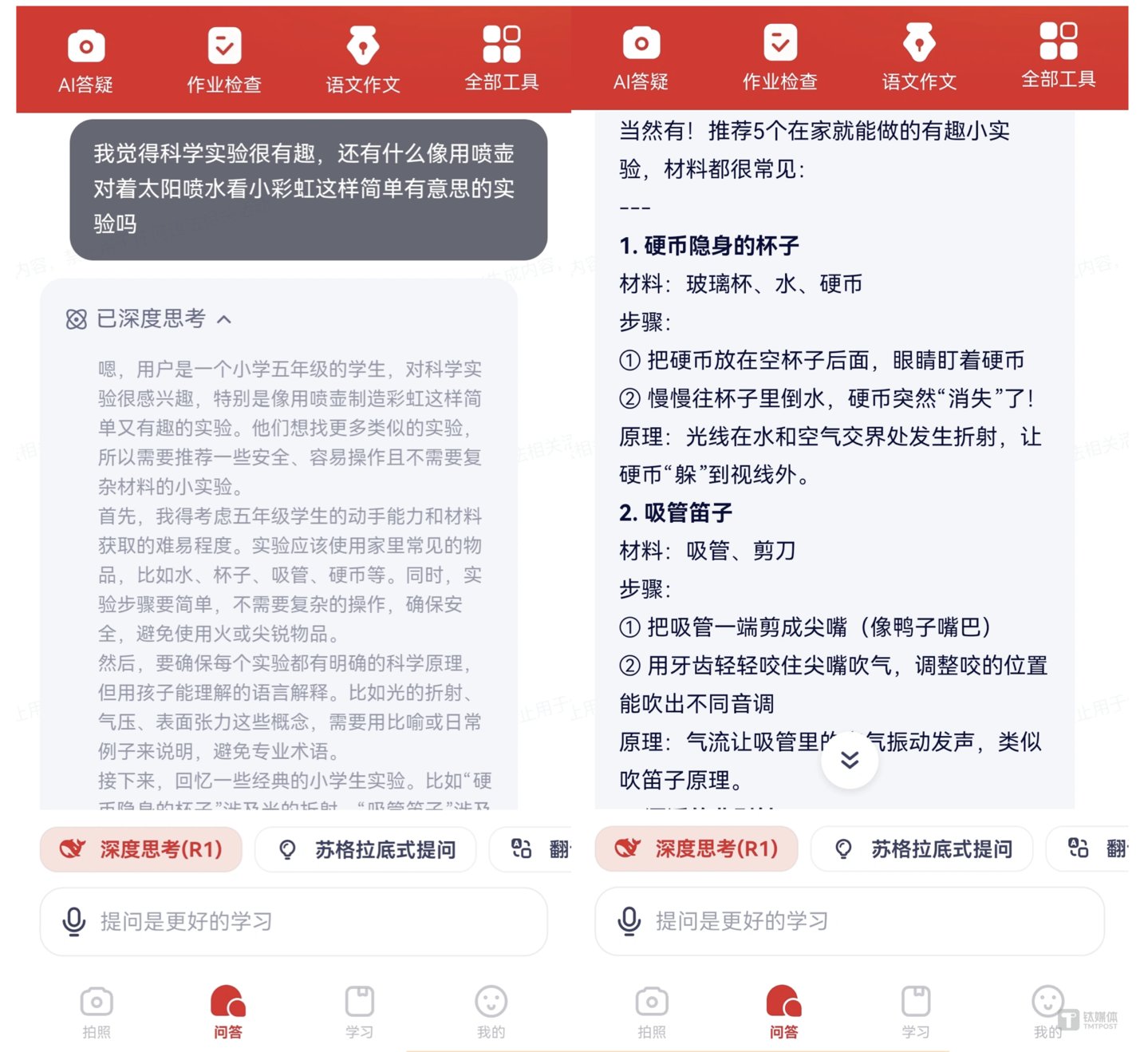 因此这也产生了一个话题,就是对于中小企业来说,接入DeepSeek之后的下一步,到底是要保证自身盈利平衡,还是持续免费提供服务?而在 AI 教育应用方向,学而思“随时问”应用App给出的答案是“持续免费”。