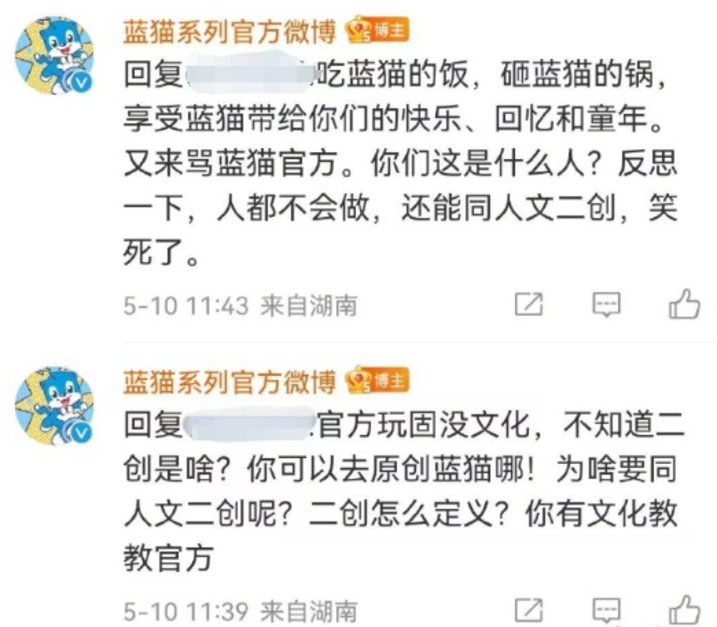 比如一代人的童年回忆《蓝猫》IP,曾荣获第十八届中国电视金鹰奖电视美术片优秀作品奖,官方对于同人作品一直持反对态度,曾公开怒怼二创同人,言语中满满都是对同人作品以及同人作者的蔑视。