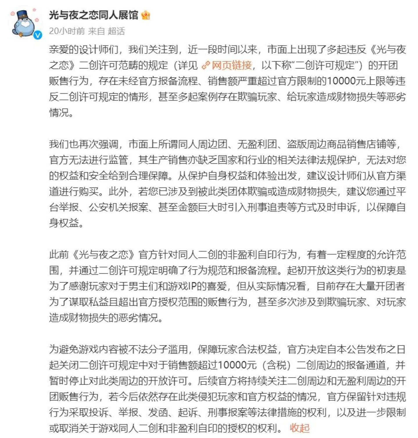 此事过后,腾讯《光与夜之恋》官方调整了二创授权,原本官方开放了二创周边,规定销售额超过10000元(含税)需进行报备,但在经过玩家被骗事件之后,官方彻底关闭了二创周边的报备通道,一刀切了盈利性质的周边。