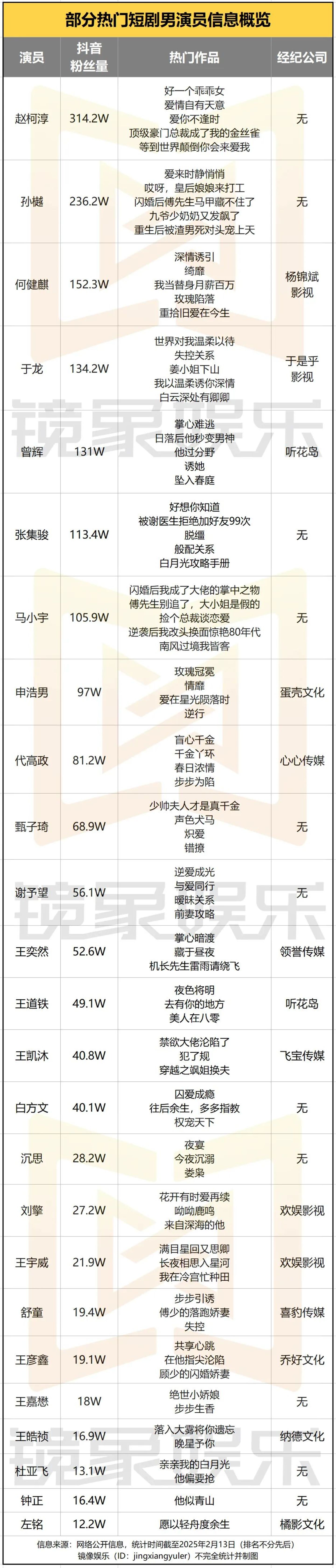 比如行业爆款率极高的短剧公司听花岛,在产出多部热门短剧的同时,其艺人经纪业务也在同步完善,目前,公司已经签约曾辉、王道铁、赵佳等多位短剧演员。基于公司在精品短剧方面的创作实力,公司艺人的整体成长速度更快,比如听花岛旗下的演员曾辉,当前关联的热门短剧内容仅13部,而其抖音粉丝量已落在130万以上,同量级的演员中,何健麒、于龙的关联热剧数量分别为34部和44部。