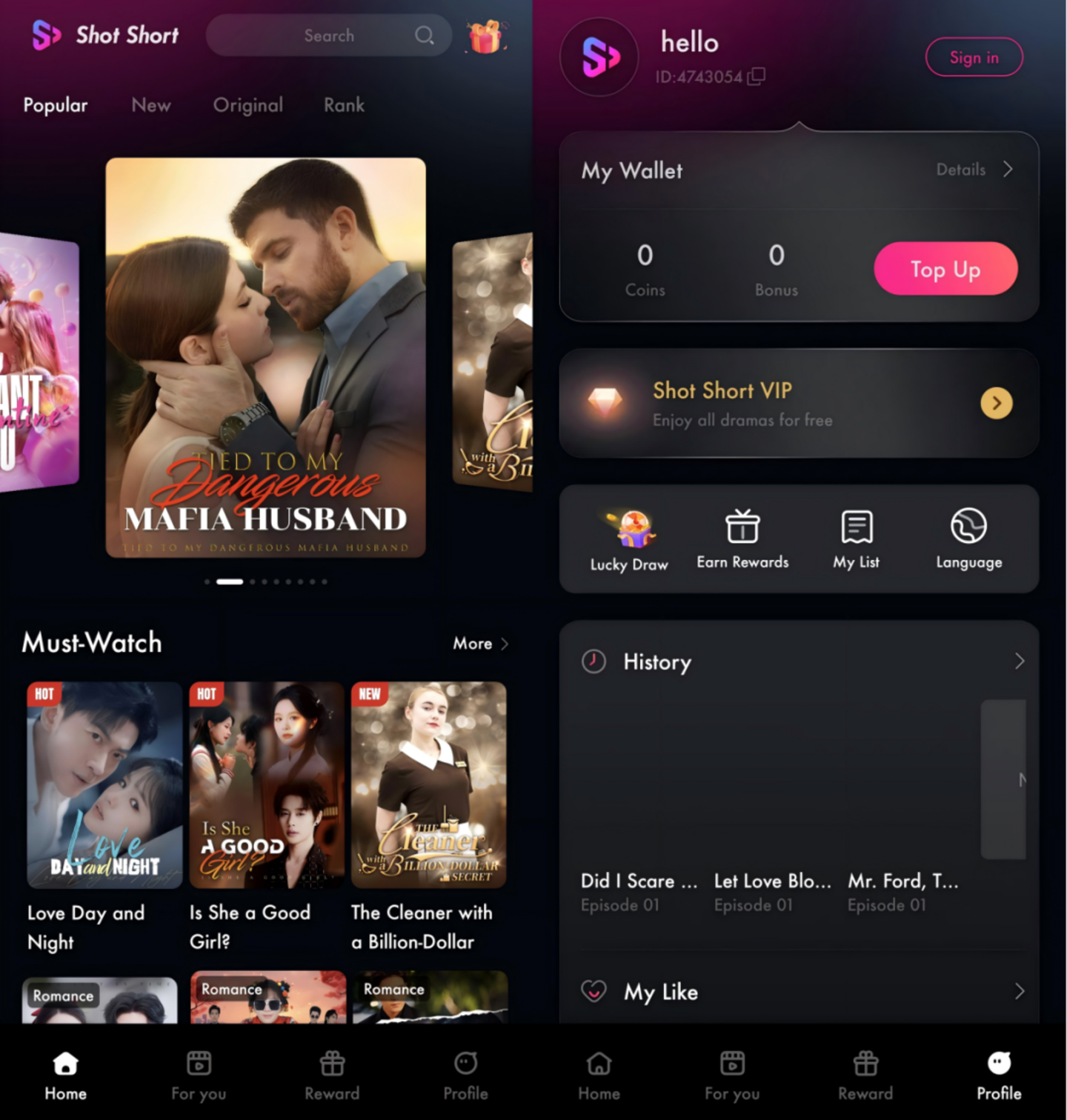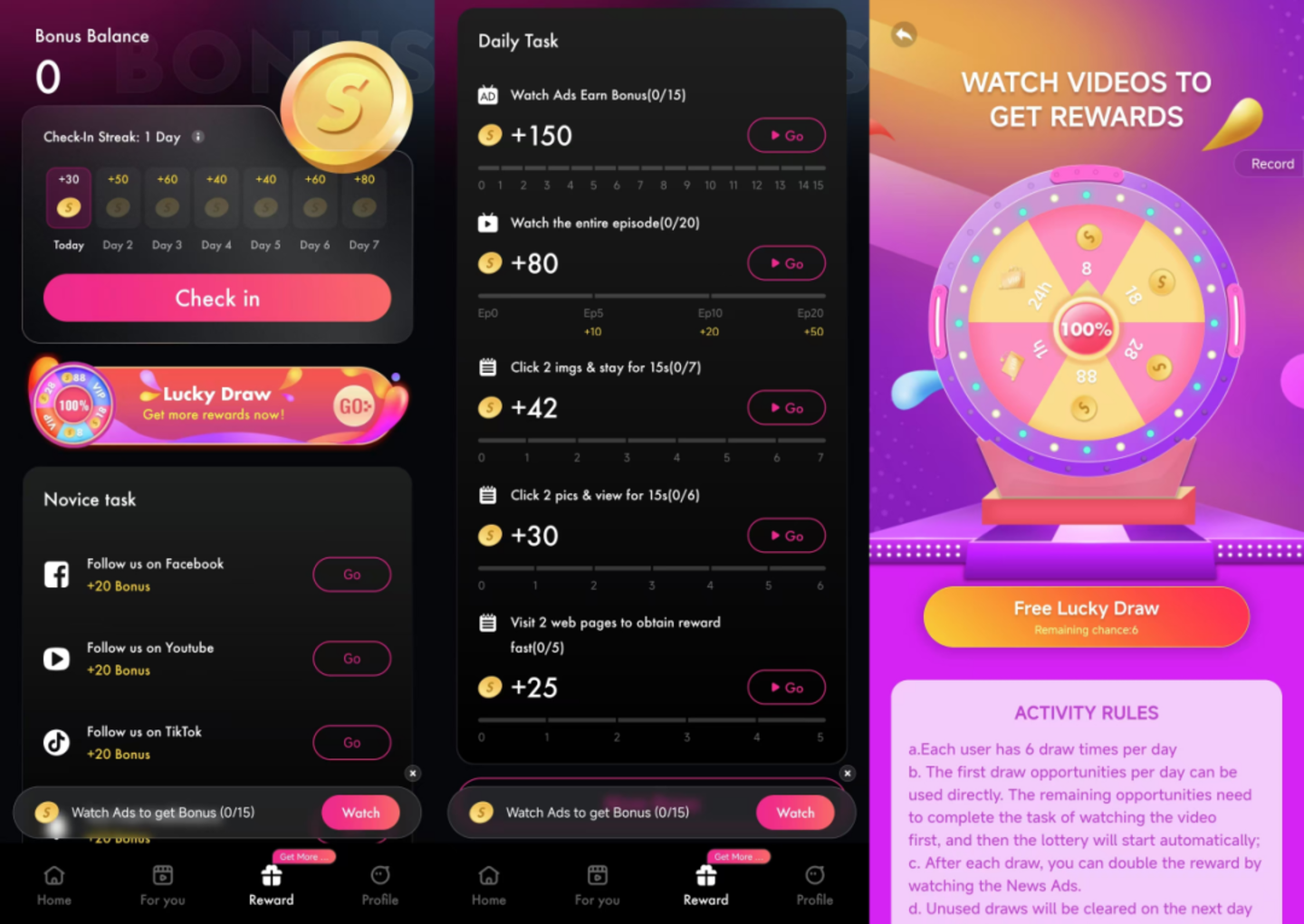 此外,DataEye研究院还注意到,Shot Short在海外也采取了类似国内“看广告领红包”的用户激励模式,并将“福利”入口放到了底部一级导航栏。