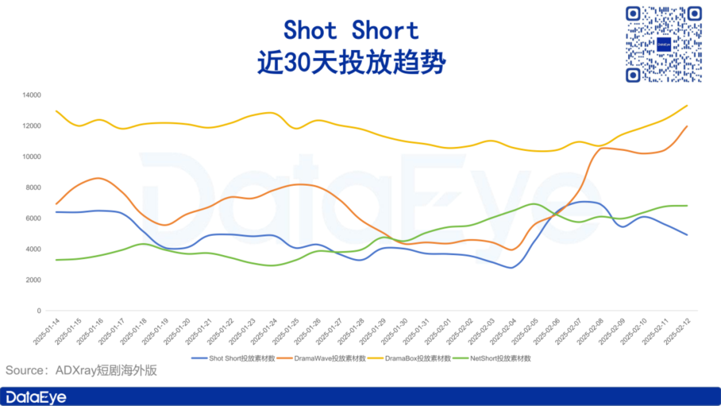 再对比以上4个平台近30天投放趋势发现,Shot Short、DramaWave及DramaBox素材量走势相似,均为2月初投放素材量偏低,而后大幅提升;NetShort在整个2月份素材量基本保持在稳定状态。