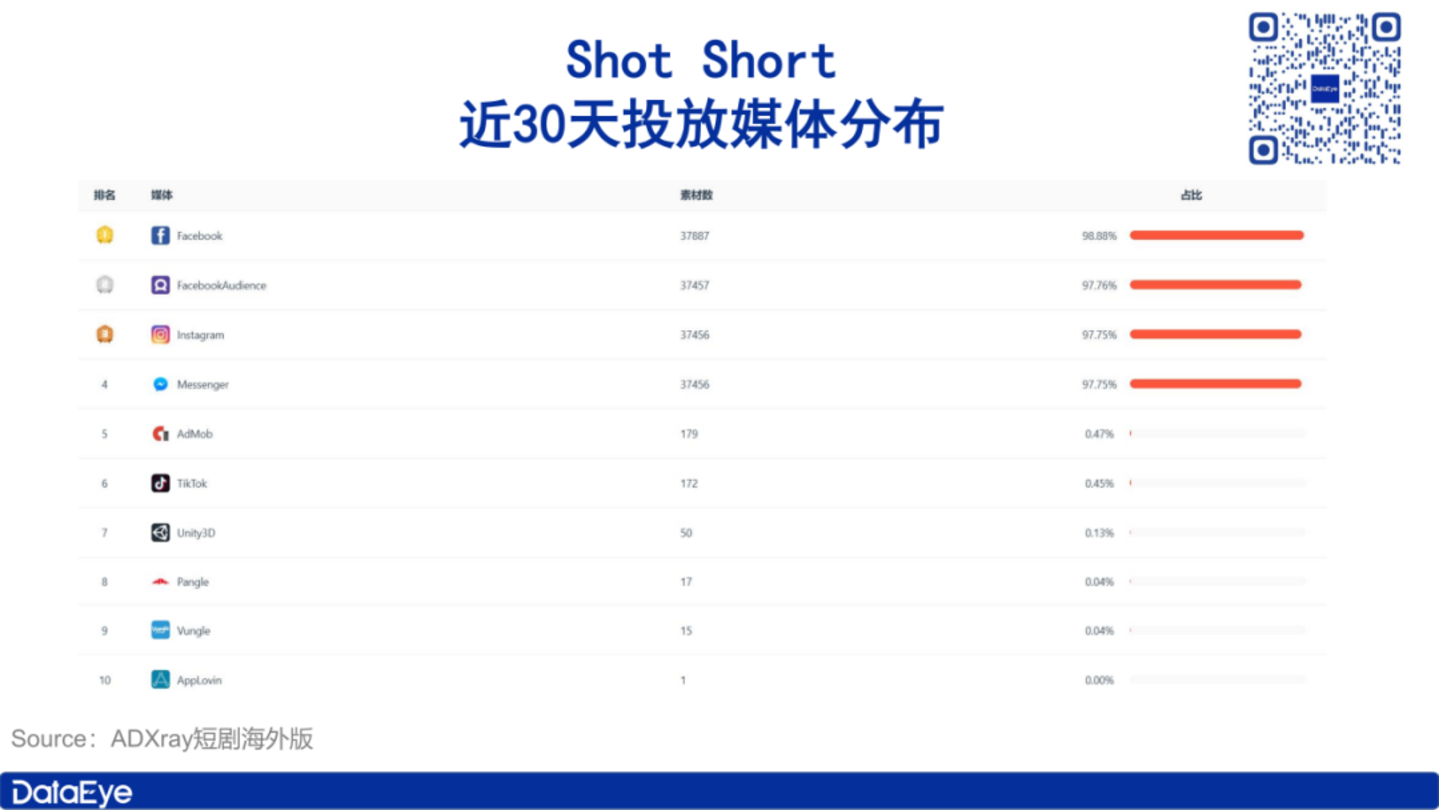 ADX短剧海外版数据显示,截至2月13日,近30天Shot Short投放媒体以Facebook、Facebookaudience、Instagram、及Messenger为主,这4家媒体所投放素材量相差不大。