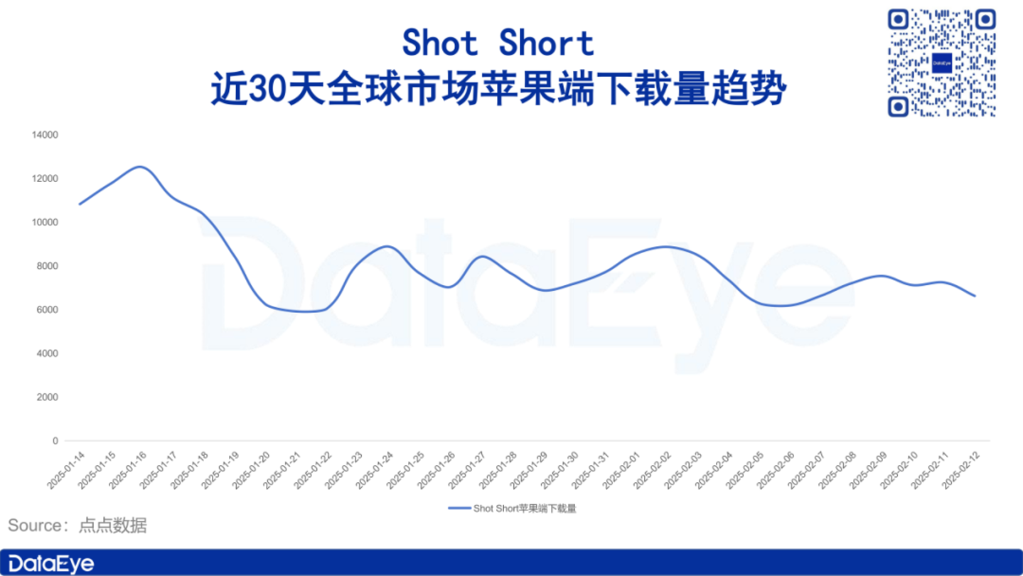 点点数据显示,2025年1月下旬以来,Shot Short全球市场苹果端下载量维持在相对稳定状态,日下载量普遍在7000次左右。