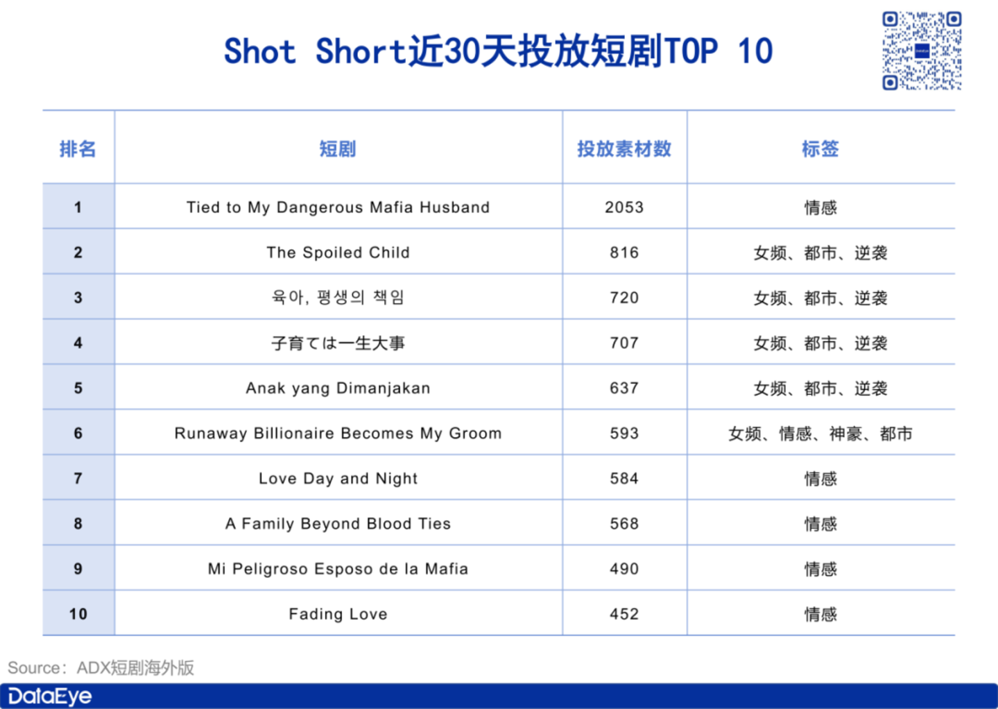 ②近30天Shot Short投放短剧TOP 10中,一部短剧有多种语言译制版本上榜,可能的原因在于一方面用译制剧降低成本、另一方面用测试出的爆款短剧翻译成当地语言去打开当地市场。