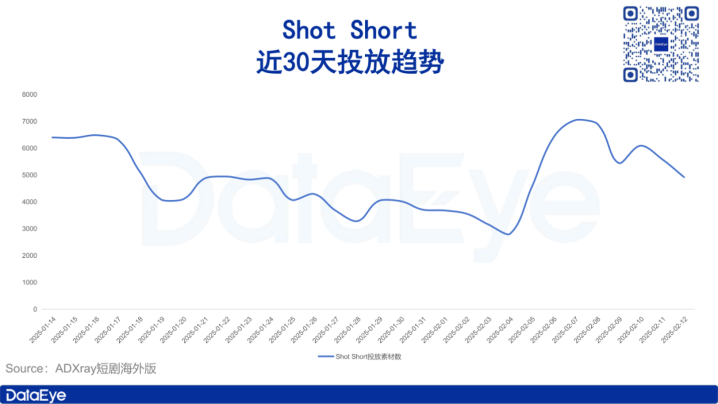 ADX短剧海外版数据显示,近30天Shot Short自1月18日开始日投放素材量逐步下滑,至2月4日降至最低,日投放素材量2801组;而后,投放力度开始逐步提升,并于2月7日达最高单日投放素材量7039组。