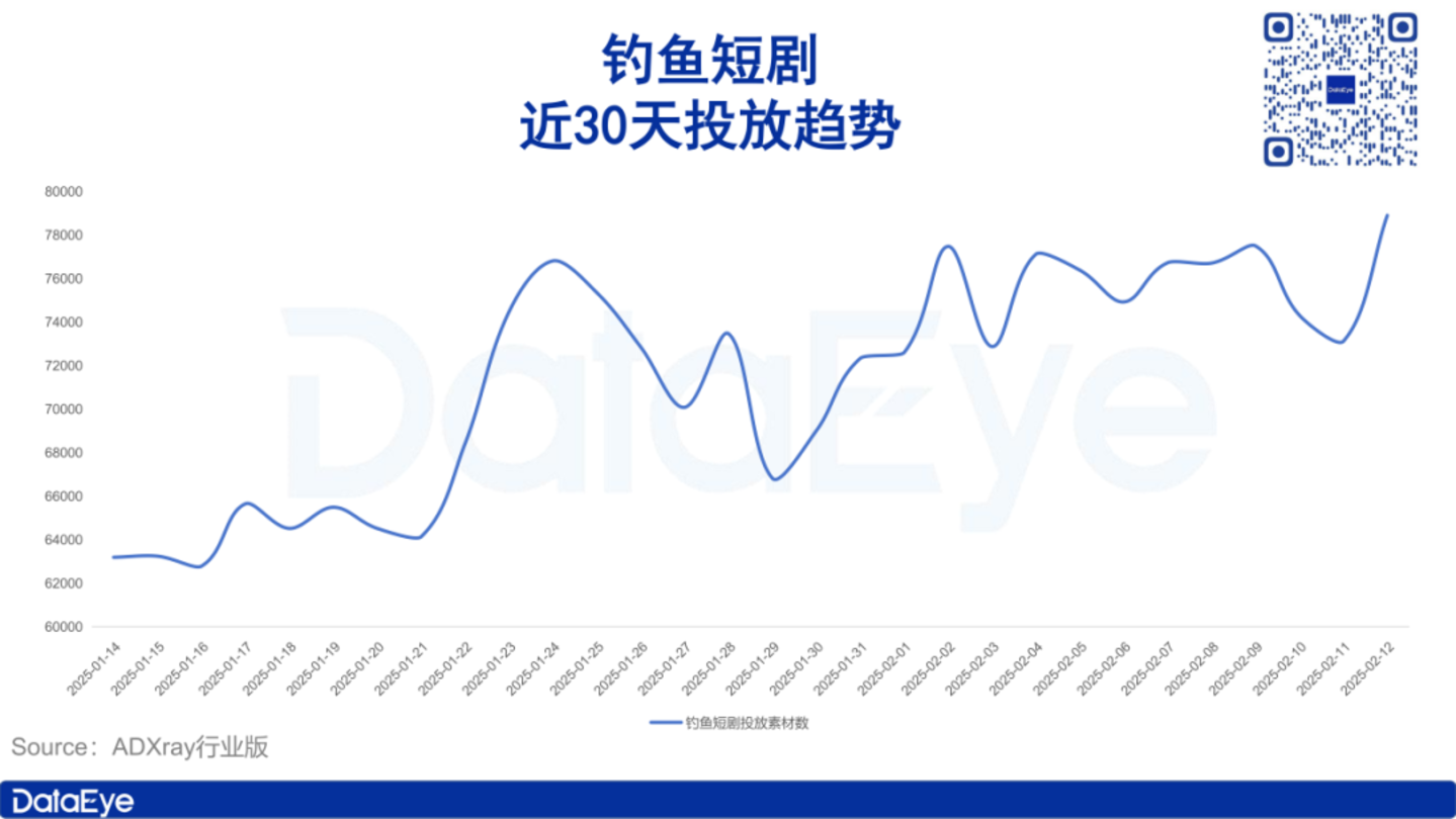ADX行业版数据显示,近30天钓鱼短剧共投放素材量30.1万组。