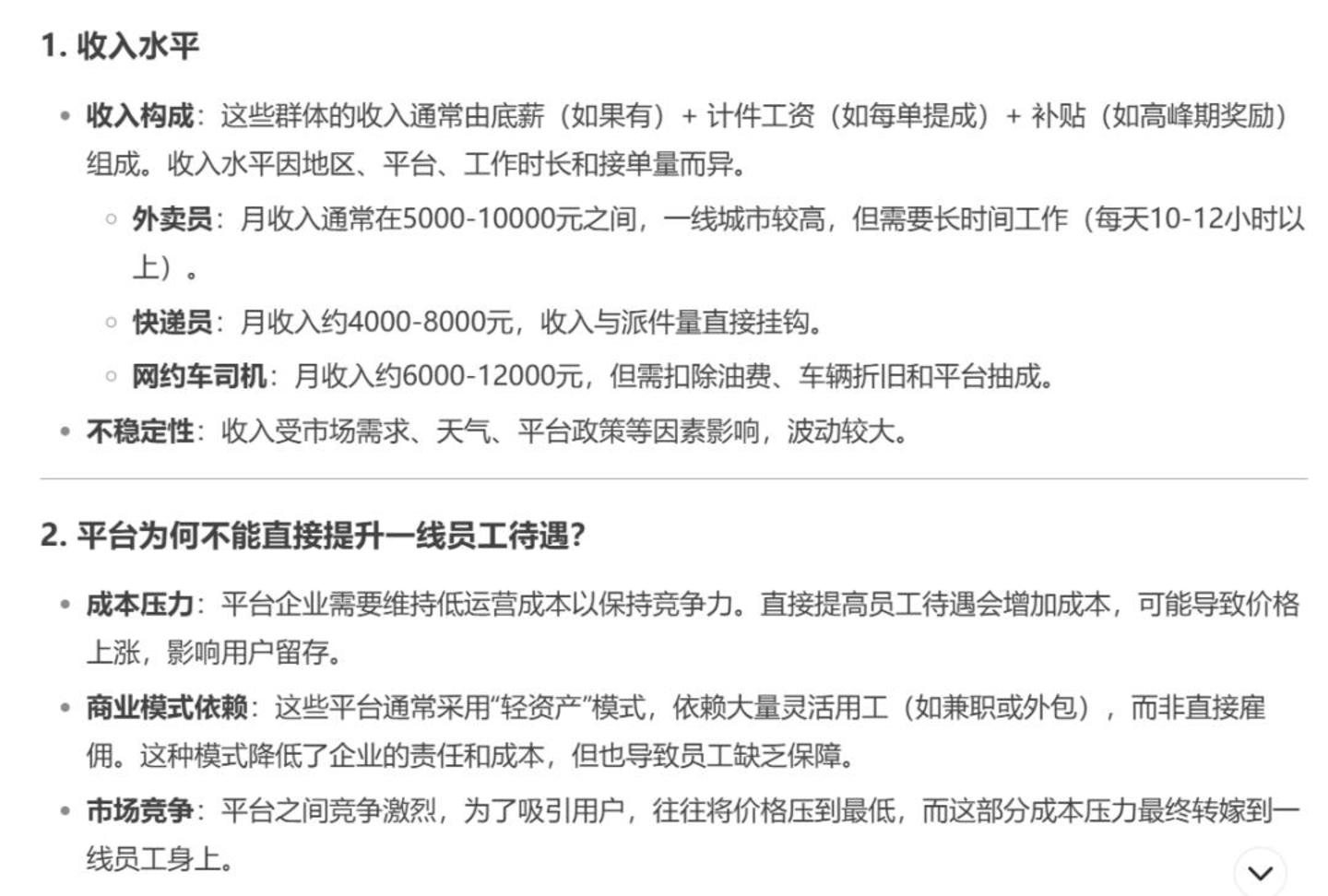 至于平台为什么不能直接提升员工待遇,DeepSeek提到了三点: