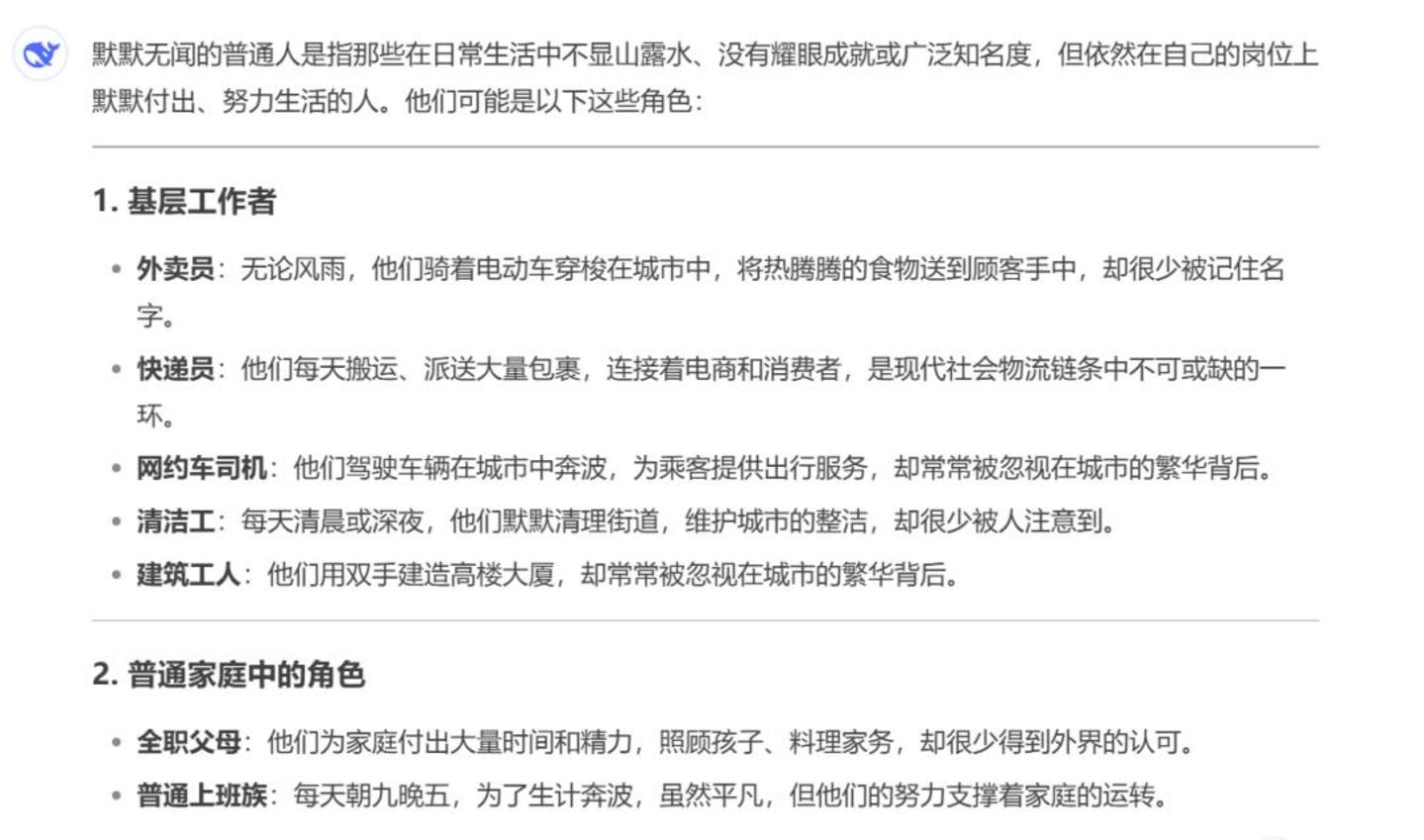 顺着这个问题,我又开始为难DeepSeek,问它,“那么,你认为谁是默默无闻的普通人?”