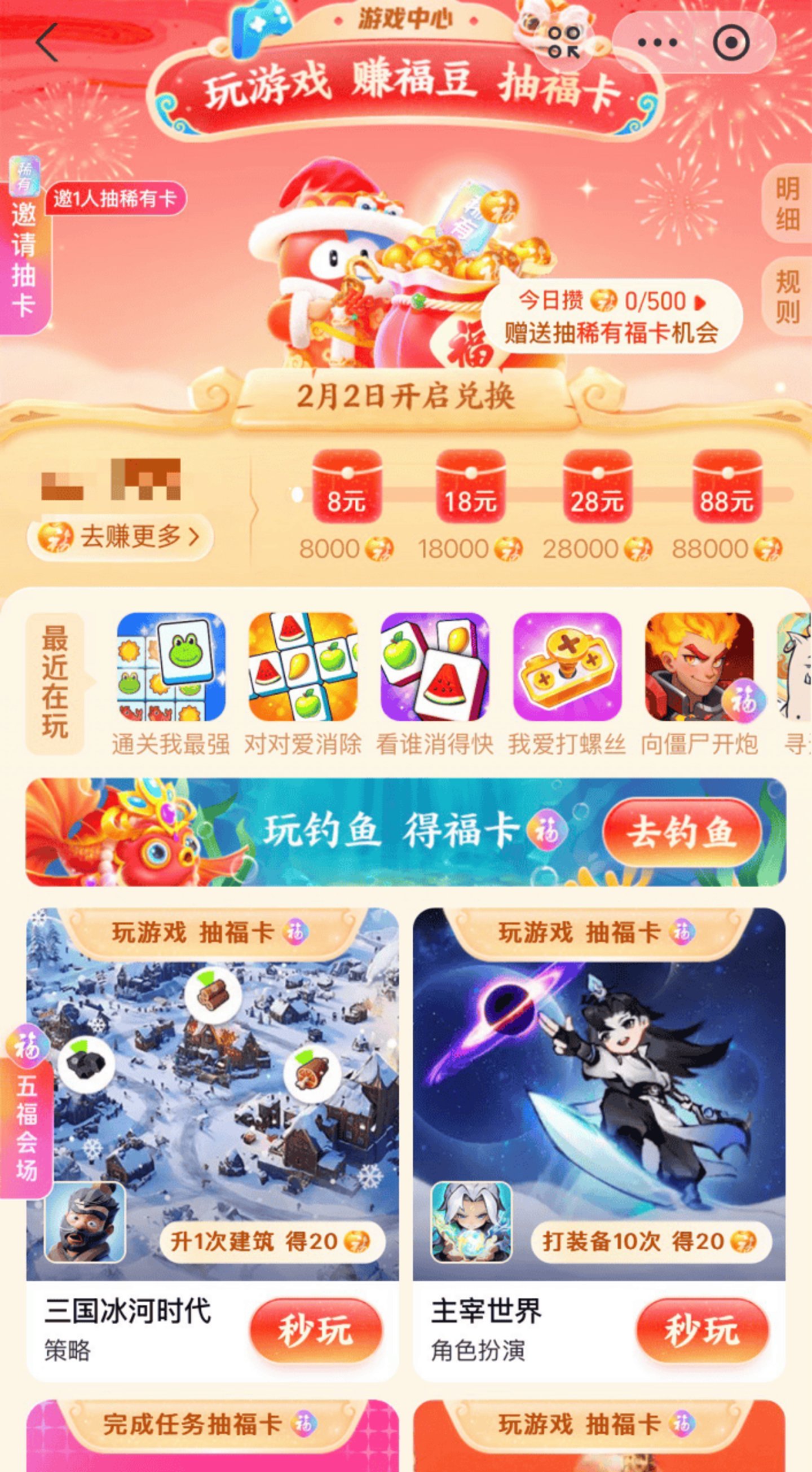 新年抽福卡的次数有限,玩小游戏能积攒福豆换取更多抽卡机会,总之是闲着无聊,集福第一天,能不能抽到卡已经无所谓了,他的支付宝界面逐渐被小游戏挤爆。