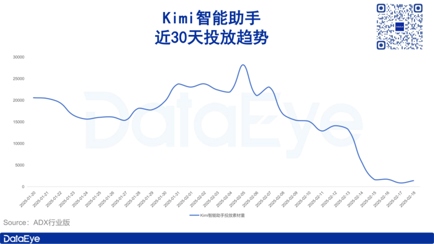 ADX行业版数据显示,自2月14日开始,Kimi智能助手投放力度便大幅下滑,2月15日投放力度几乎触底,至今维持在单日素材量1500组左右,较此前日均2万组投放素材量,大幅下滑了92.5%。