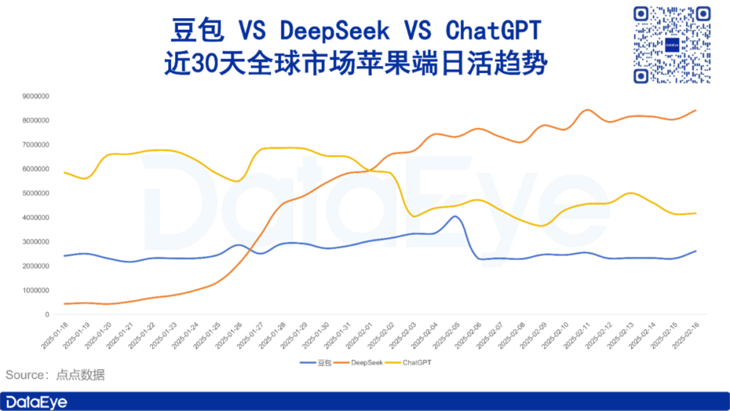 点点数据显示,近30天豆包、DeepSeek及ChatGPT三款产品日活走势可总结为“一升两降”。其中,DeepSeek日活始终处于上升态势,尤其是1月26日、27日两天,日活迅速由几十万级别攀升至数百万,进入2月份之后,进入缓步上升态势。