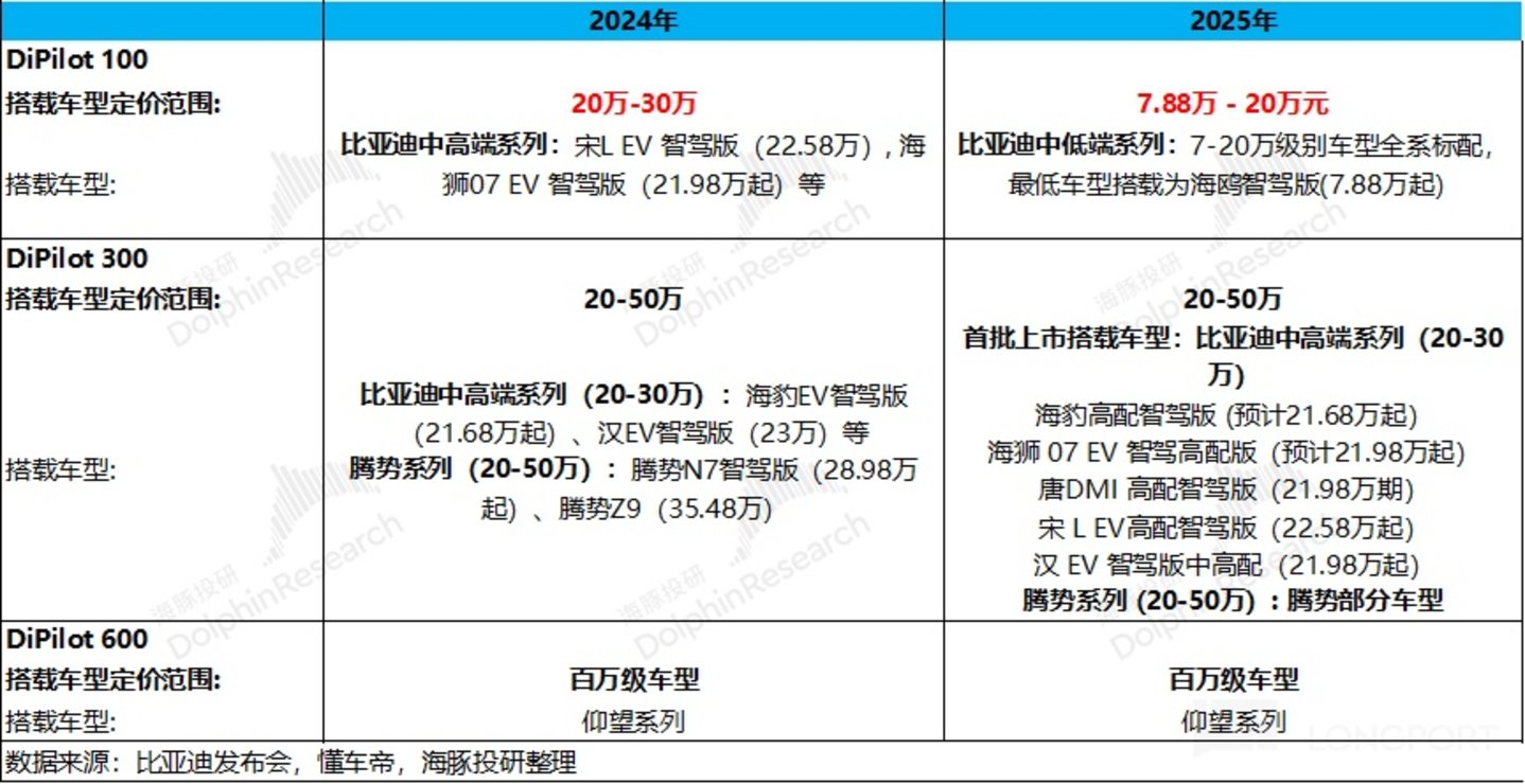 ② 升级智驾功能的车型基本做到增配不加价:升级智驾版车型定价基本与此前 2025 款保持不变,海豚君预计比亚迪主要通过:a 规模化优势;b Dpilot 100 方案部分智驾零部件自研;c 压降供应商成本等方式等方式实现。