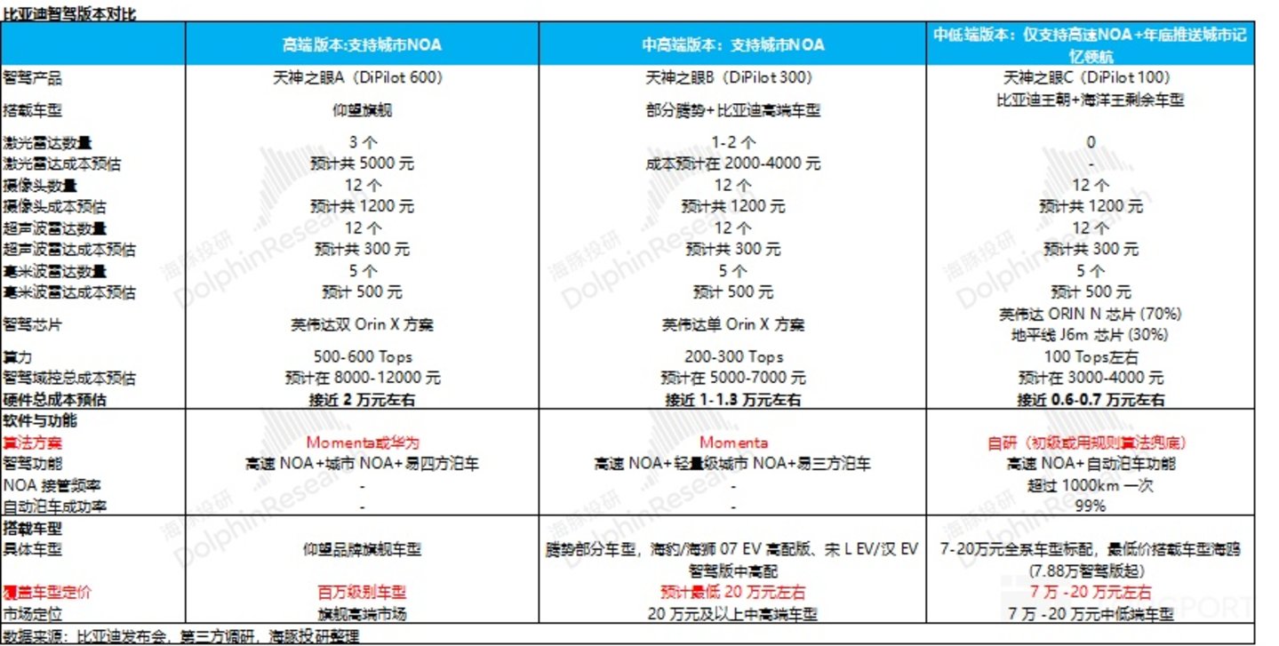 ② 拆分比亚迪三个智驾版本的硬件和软件配置来看(结合第三方调研信息):