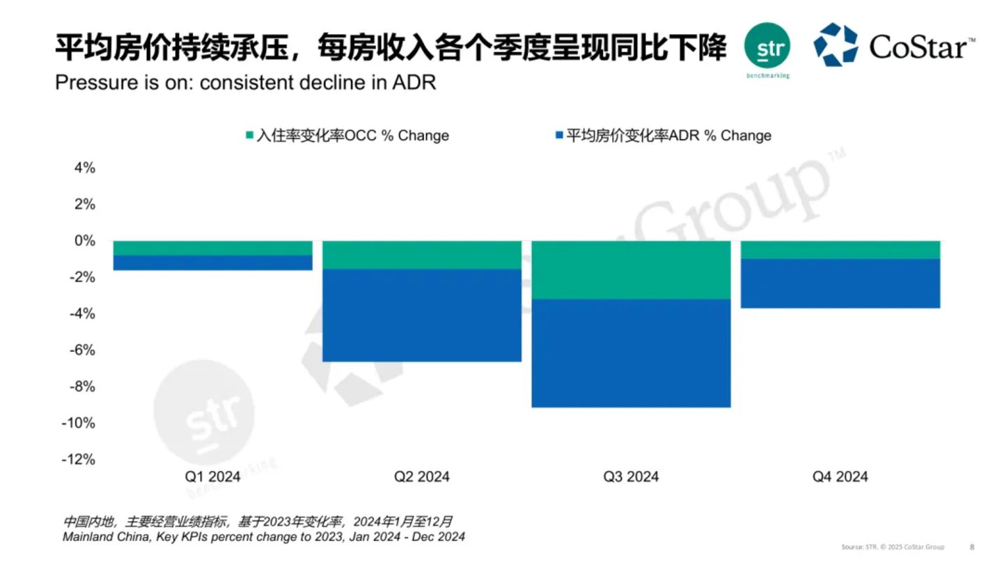 2024年全国酒店平均入住率下降2%,平均房价下跌4%,RevPAR下跌6%;
