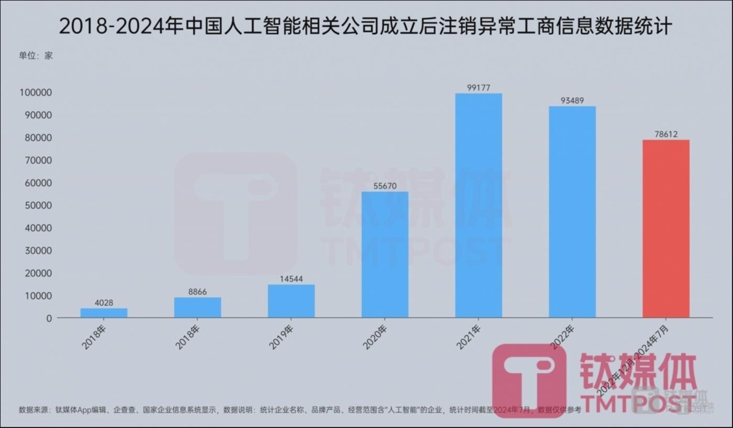 据钛媒体AGI从企查查处统计,自2022年11月底到2024年7月29日,国内新注册成立后现在却处于注销吊销或停业异常状态的AI相关公司数量达78612家,接近8万家企业,占同期新注册87.8万家企业总量的8.9%。