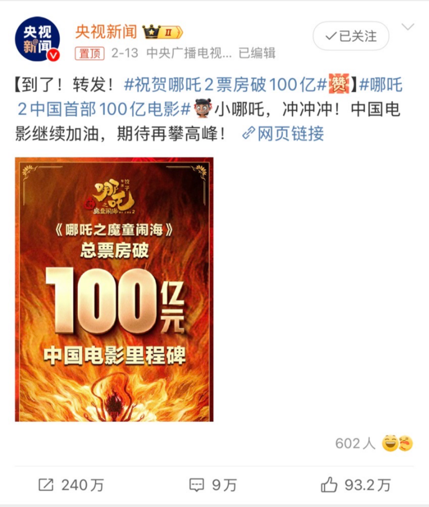 以《哪吒2》冲顶全球影史票房为例,作为中国本土文化创意产业崛起的代表,官民上下参与“百亿项目”,助力票房“升国旗”。当《哪吒2》票房突破100亿中国电影里程碑,@央视新闻第一时间在微博发布图文祝贺,之后,多位娱乐圈的导演、艺人纷纷转发,为“小哪吒”打call。“哪吒2破100亿”话题词迅速冲上热搜榜第一位,在榜时长超过19小时,累计阅读量超10亿!