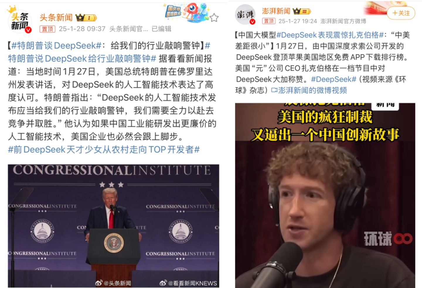 重要性上,DeepSeek在海外爆火,登顶苹果美国地区免费APP下载排行榜,引发特朗普、OpenAI创始人、扎克伯格等美国社会名人在外媒发表看法,信息倒灌回国内,相关话题登上微博热搜,再加上以@央视新闻为代表的官媒的报道,瞬间激发大众的民族自信心和集体荣誉感,助力议题更大范围破圈。