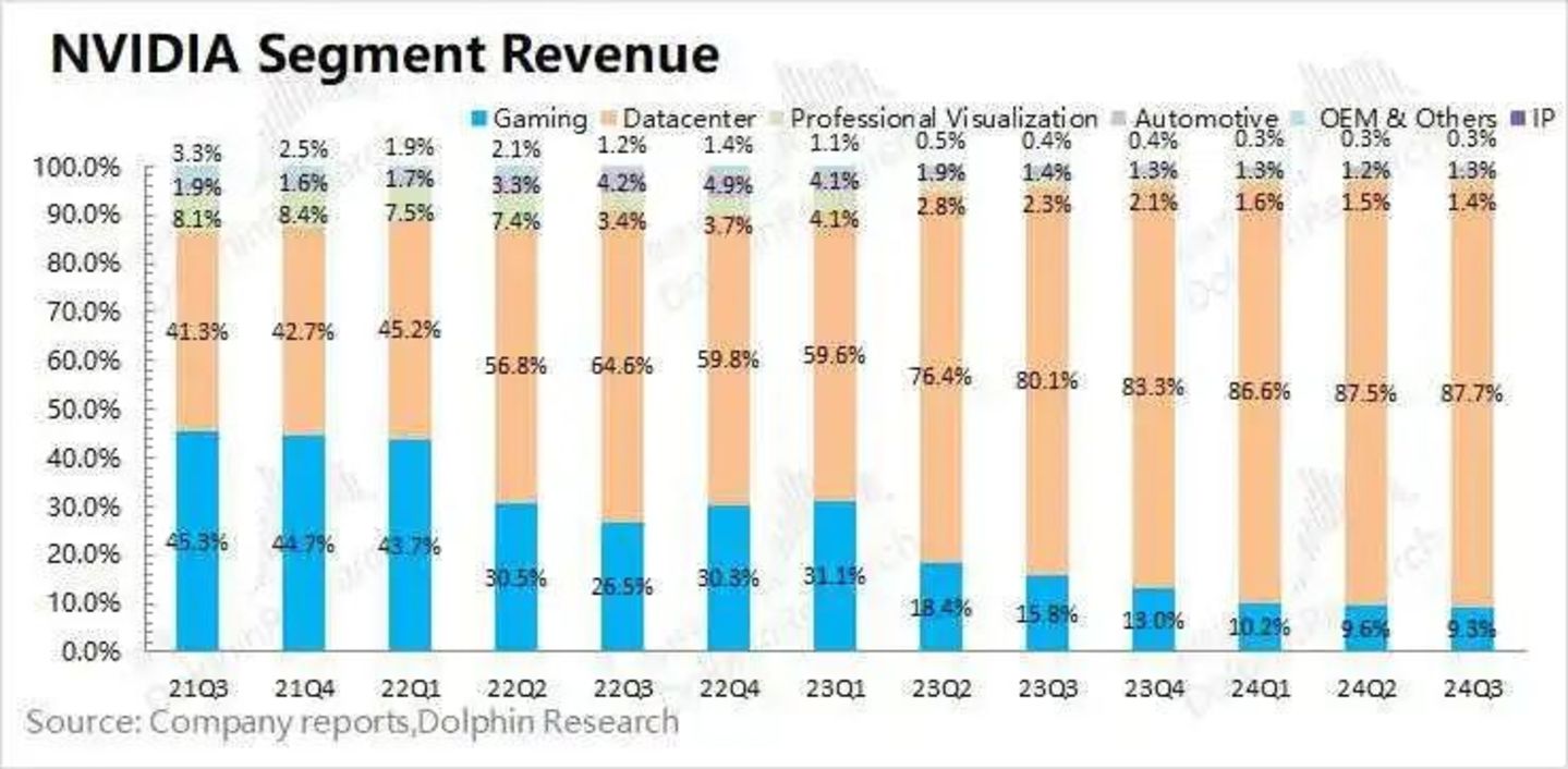 通过高质量的通信网络串联起高算力的GPU后,随着AI技术飞速发展,数据中心业务逐渐成为英伟达的营收支柱。财报显示,2024年Q3,英伟达数据中心业务营收308亿美元,同比增长112%,营收占比高达87.79%。