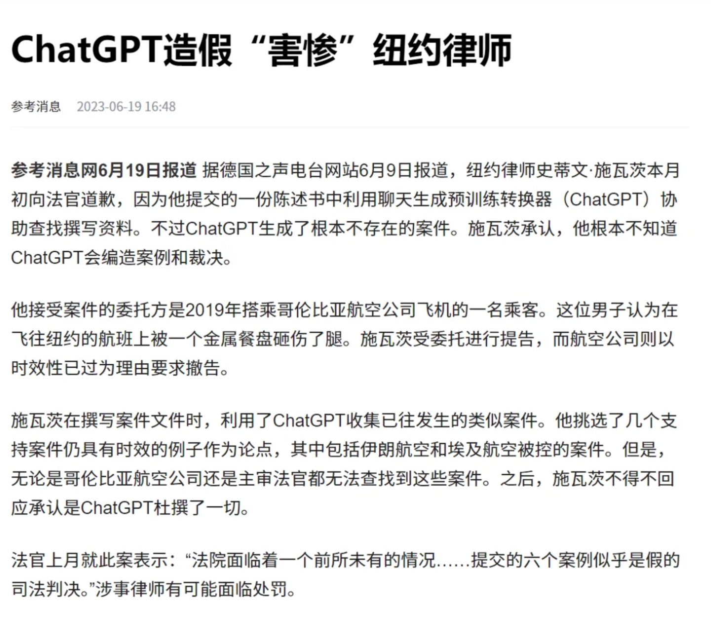 之前ChatGPT就生成了6个不存在的案件,把一名美国律师忽悠惨了。