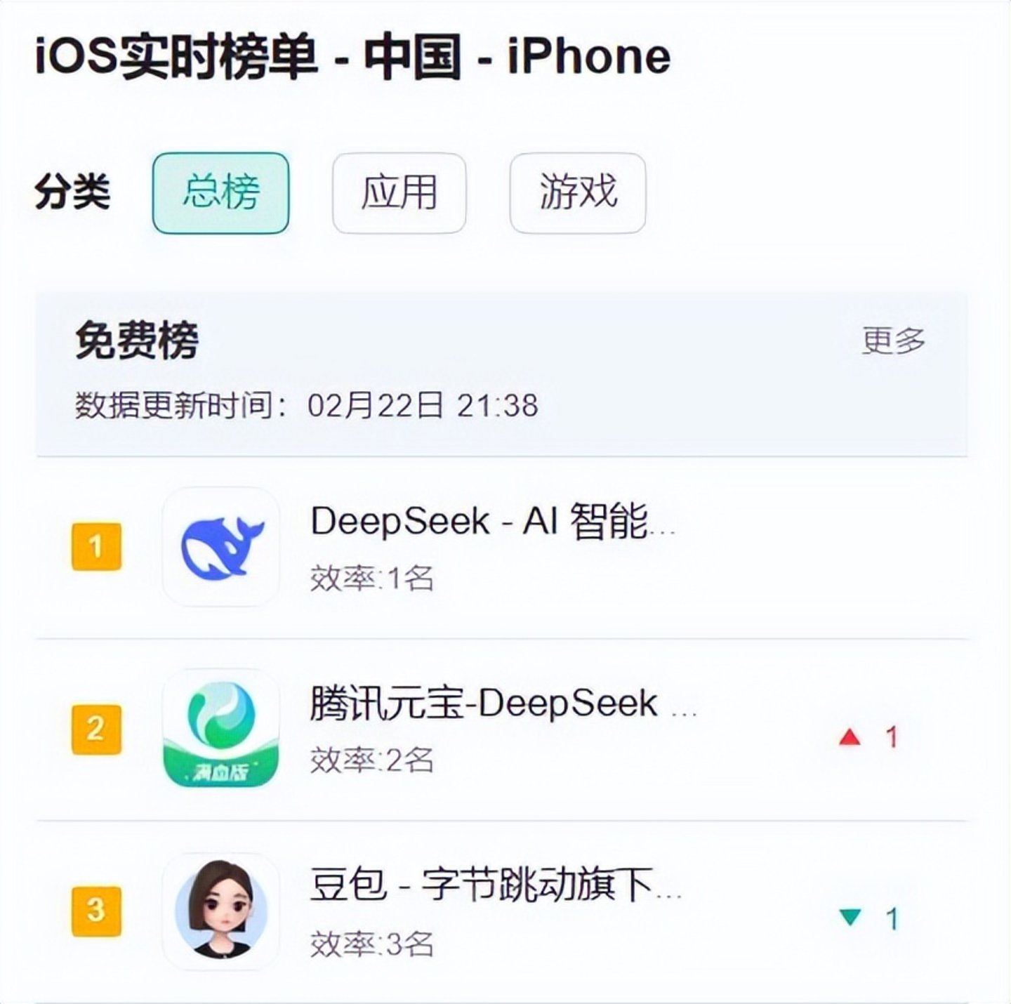 2 月 22 日周六下午,腾讯元宝成为苹果应用商店免费app排行榜第二的应用,第一是DeepSeek,第三是字节的豆包。