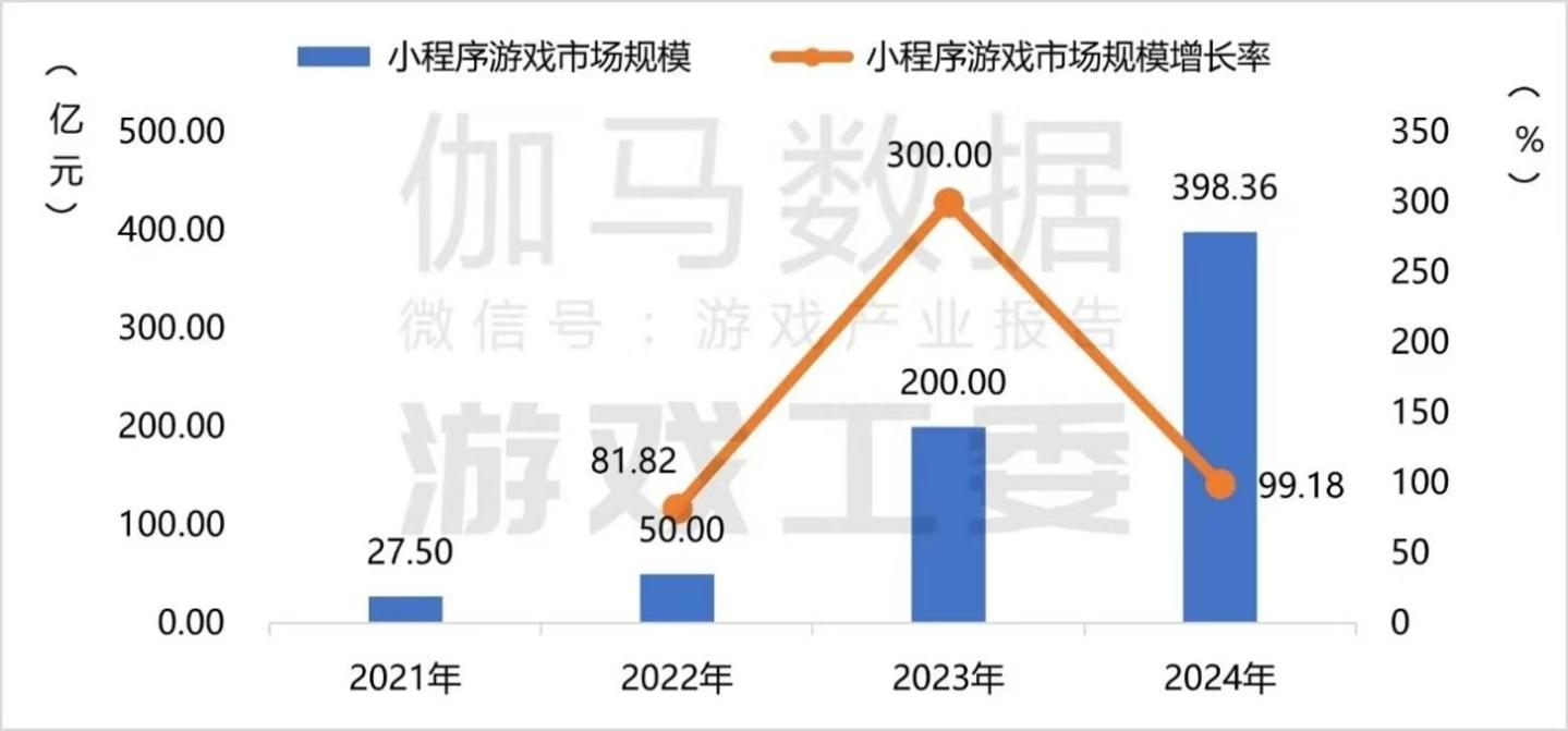根据《中国游戏产业报告》数据显示,2021年和2022年,国内小游戏市场规模仅有27.5亿元和50亿元,2023年,小游戏市场收入同比增长300%,规模达到200亿元,2024年发展并未室速,收入变为了398.36亿元,同比增长99.18%。
