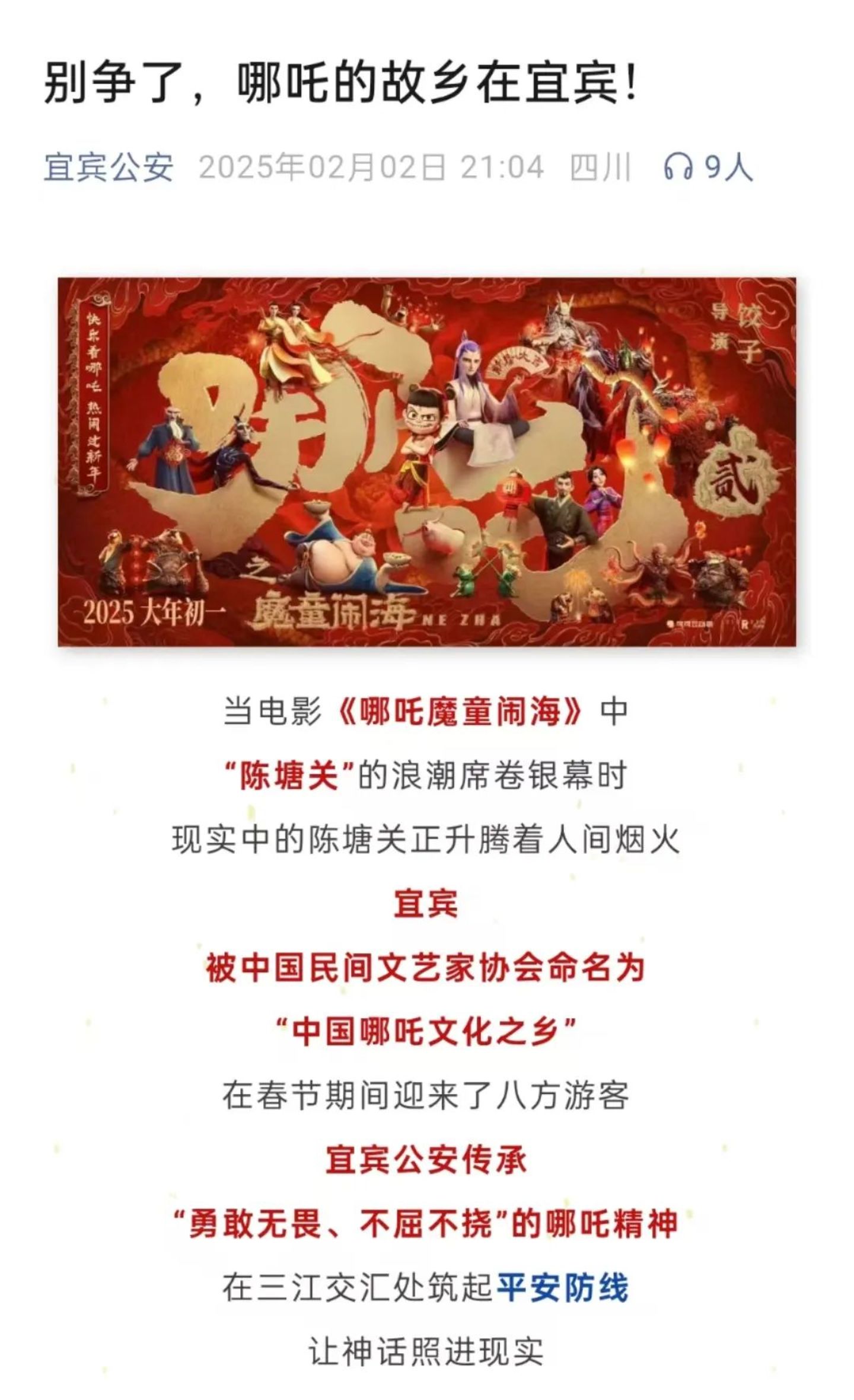 早在2月2日(大年初五),宜宾公安就发布推文《别争了,哪吒的故乡在宜宾!》,称宜宾被中国民间文艺家协会命名为“中国哪吒文化之乡”。宜宾市南广镇旧名“陈塘关”,传说是哪吒的出生地,七星山是太乙真人修行地,天池公园哪吒还身阁则是哪吒重生之地,翠屏山里有一座哪吒行宫。