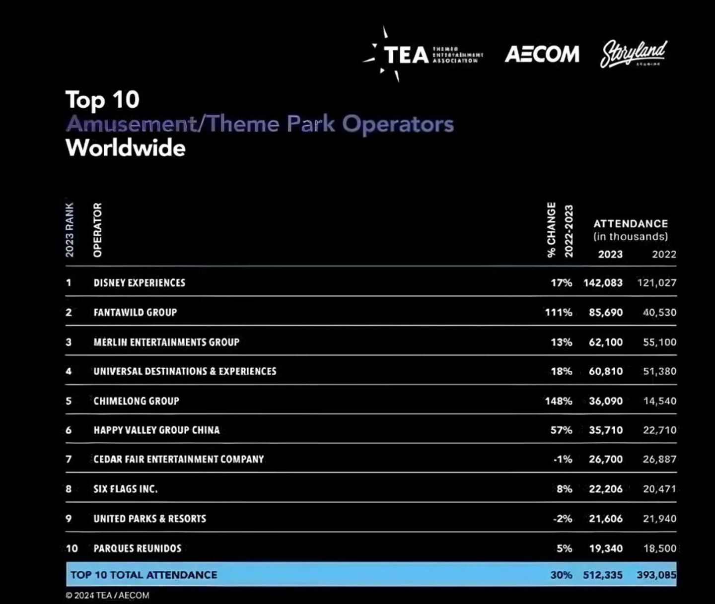 影视主题公园,则通过IP的延伸与长期沉淀,形成了以影视文化为主题的娱乐园区。迪士尼、环球无不通过旗下内容IP,打造了风靡全球的主题乐园。2016年,上海迪士尼主题公园的开幕,将中国主题乐园带入IP时代。与此同时,没落的华侨城与崛起的方特主题乐园形成对比,随着“熊出没”IP的形成,方特主题公园客流量增幅明显。据《2023全球主题公园和博物馆报》,方特集团从全球运营商榜单排名第五跃升至第二,仅次于迪士尼。