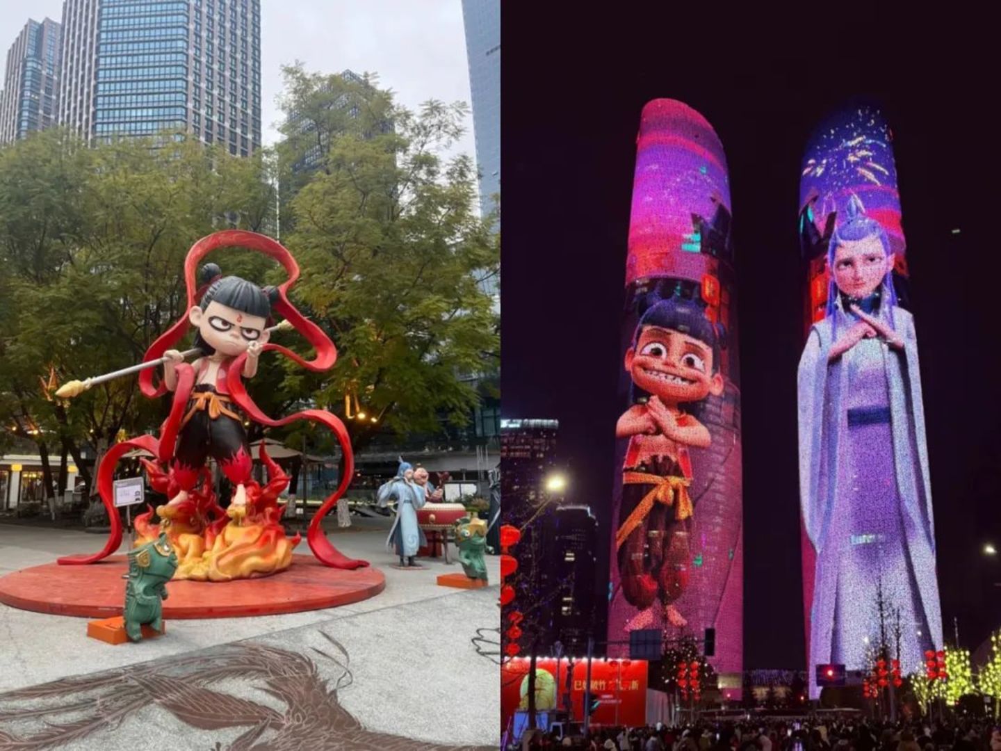 以四川和天津为例。四川文旅早在电影上映前,就在微博发布了“哪吒里的成都元素拉满了”话题。作为《哪吒2》诞生地,坐标成都的可可豆动画公司率先迎来游客打卡。成都还设立了多处哪吒主题打卡装置,如成都环球中心、成都交子商圈设有两版不同的巨型“哪吒”,天府双塔52000平米的塔屏,播放着哪吒和敖丙拜年画面。