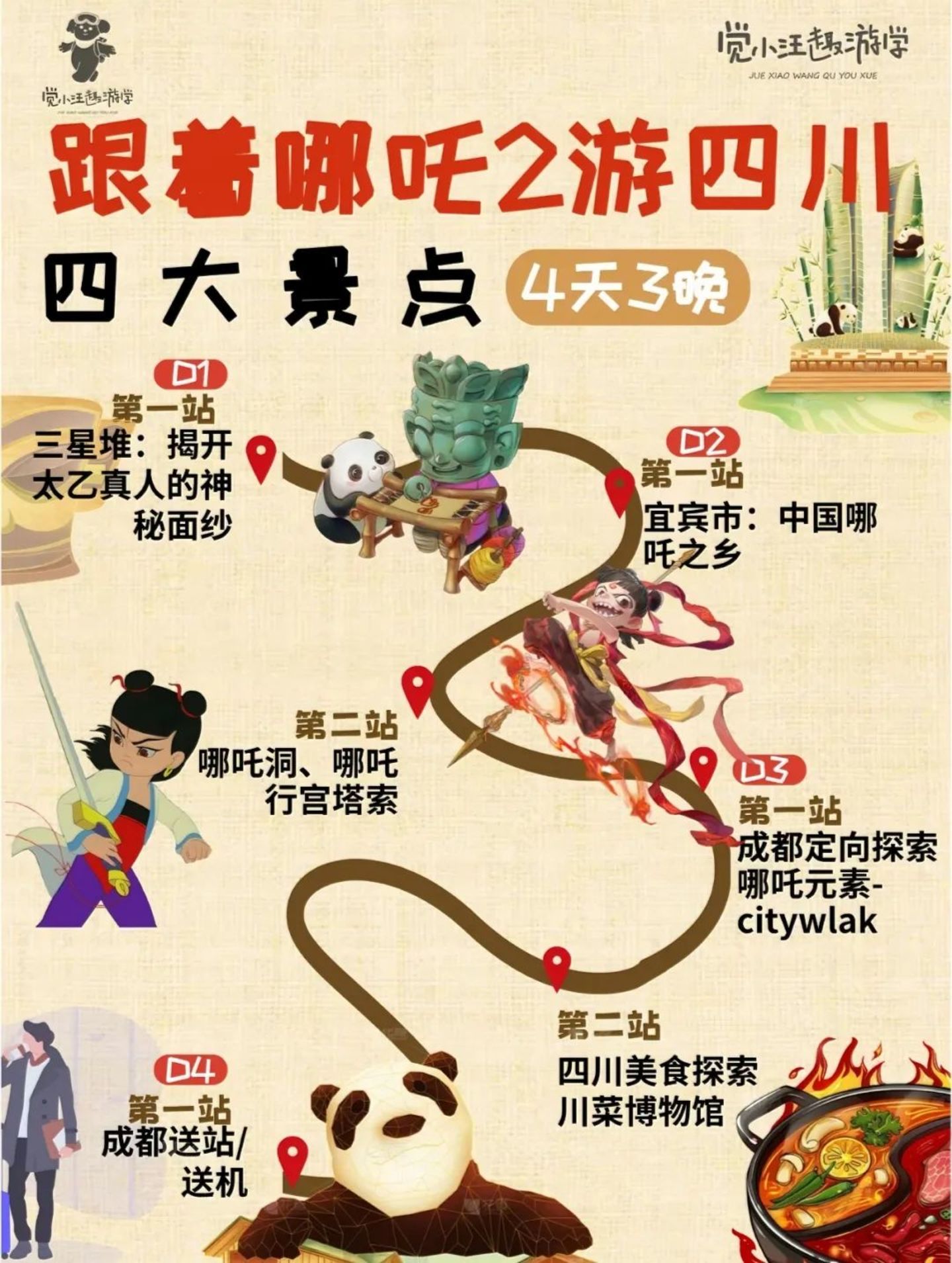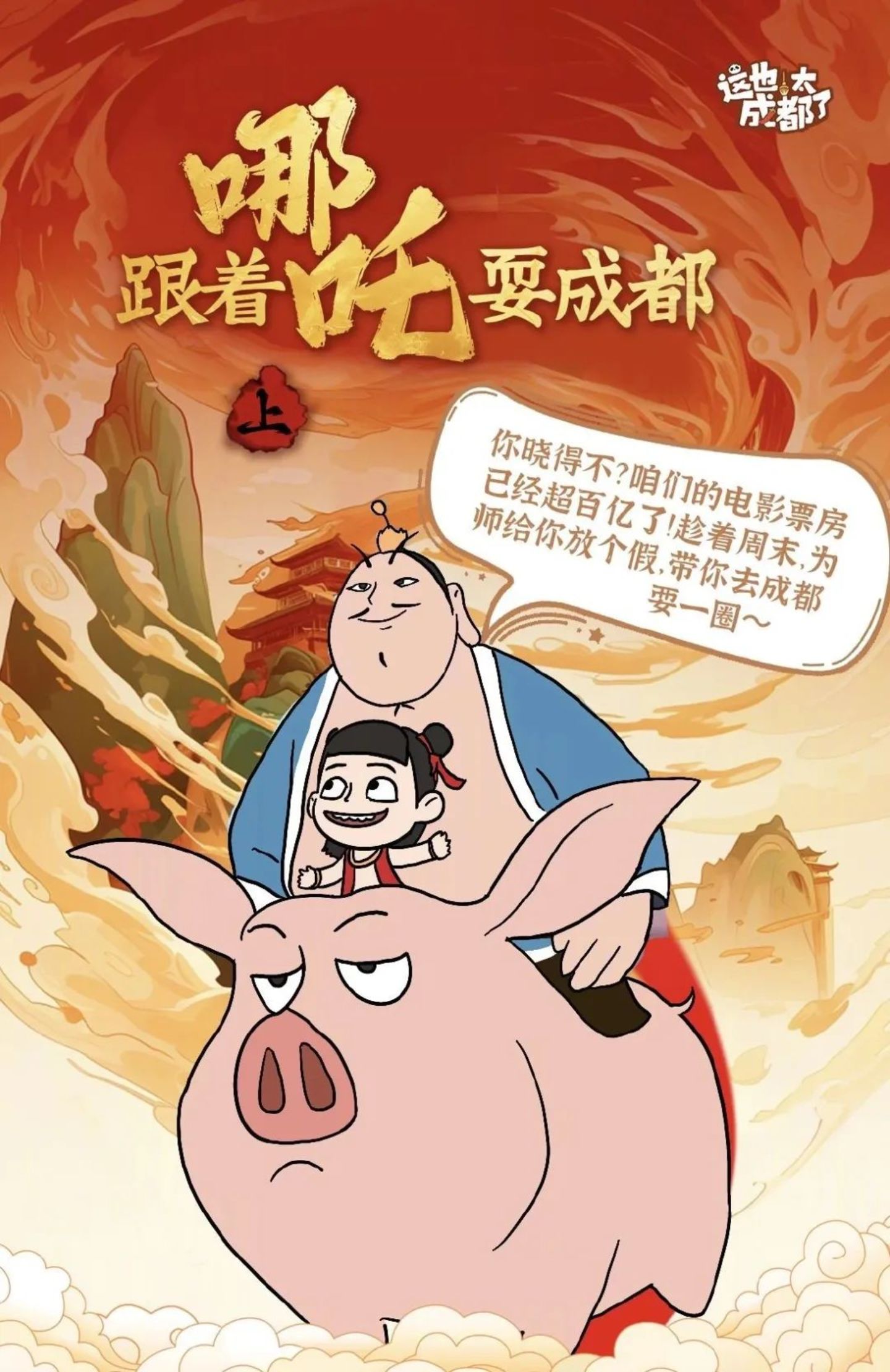 由于电影“结界兽”形象创意灵感取材于三星堆遗址和金沙遗址的青铜人像,哪吒破百亿时,@成都发布联合@金沙遗址博物馆发布#跟着哪吒耍成都#活动,串起金沙遗址博物馆、双子塔、锦江剧场、春熙路等景点,提供路线供游客打卡。宜宾哪吒行宫更是单日游客峰值达到8000人次,较往年同期增长近300%