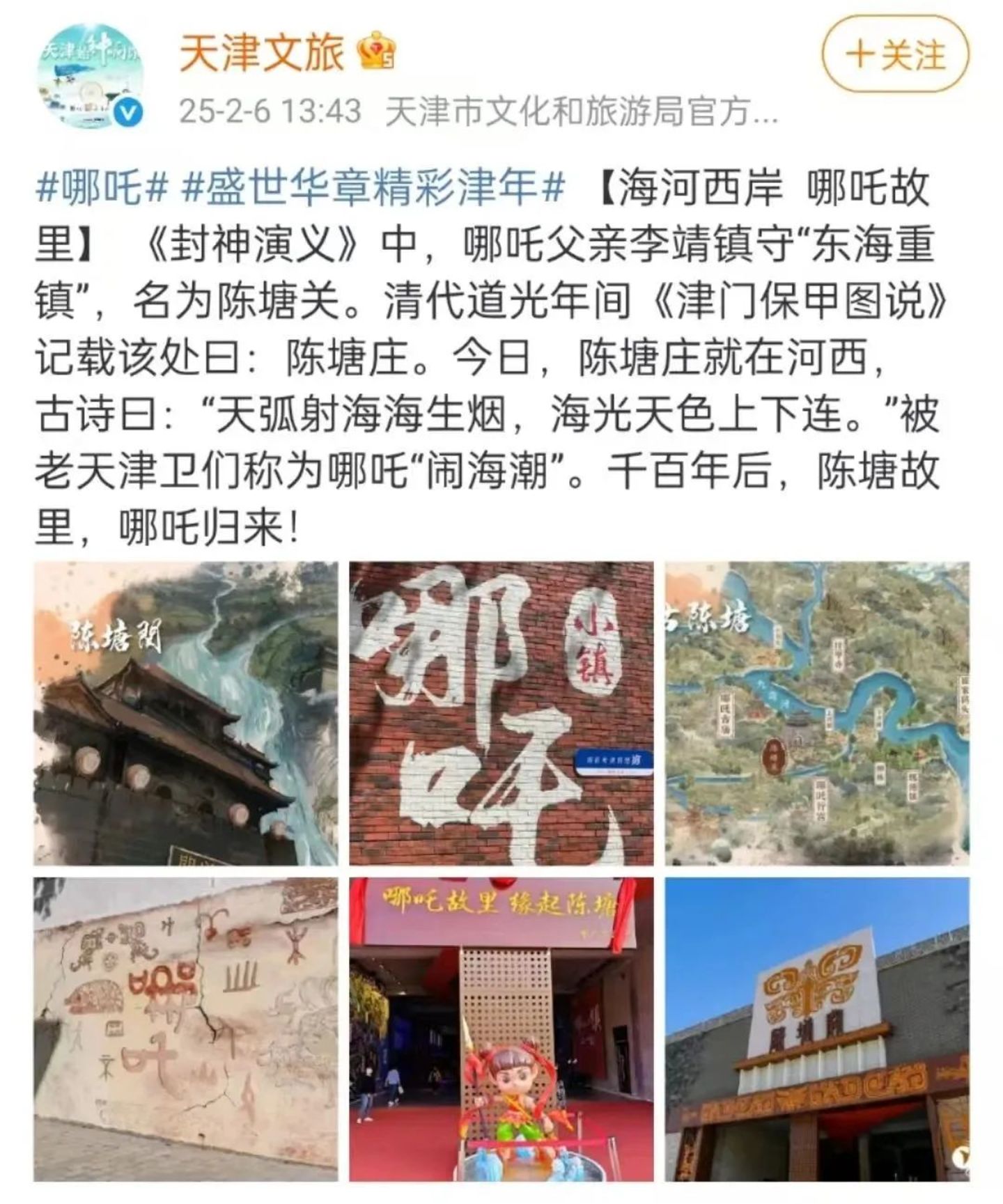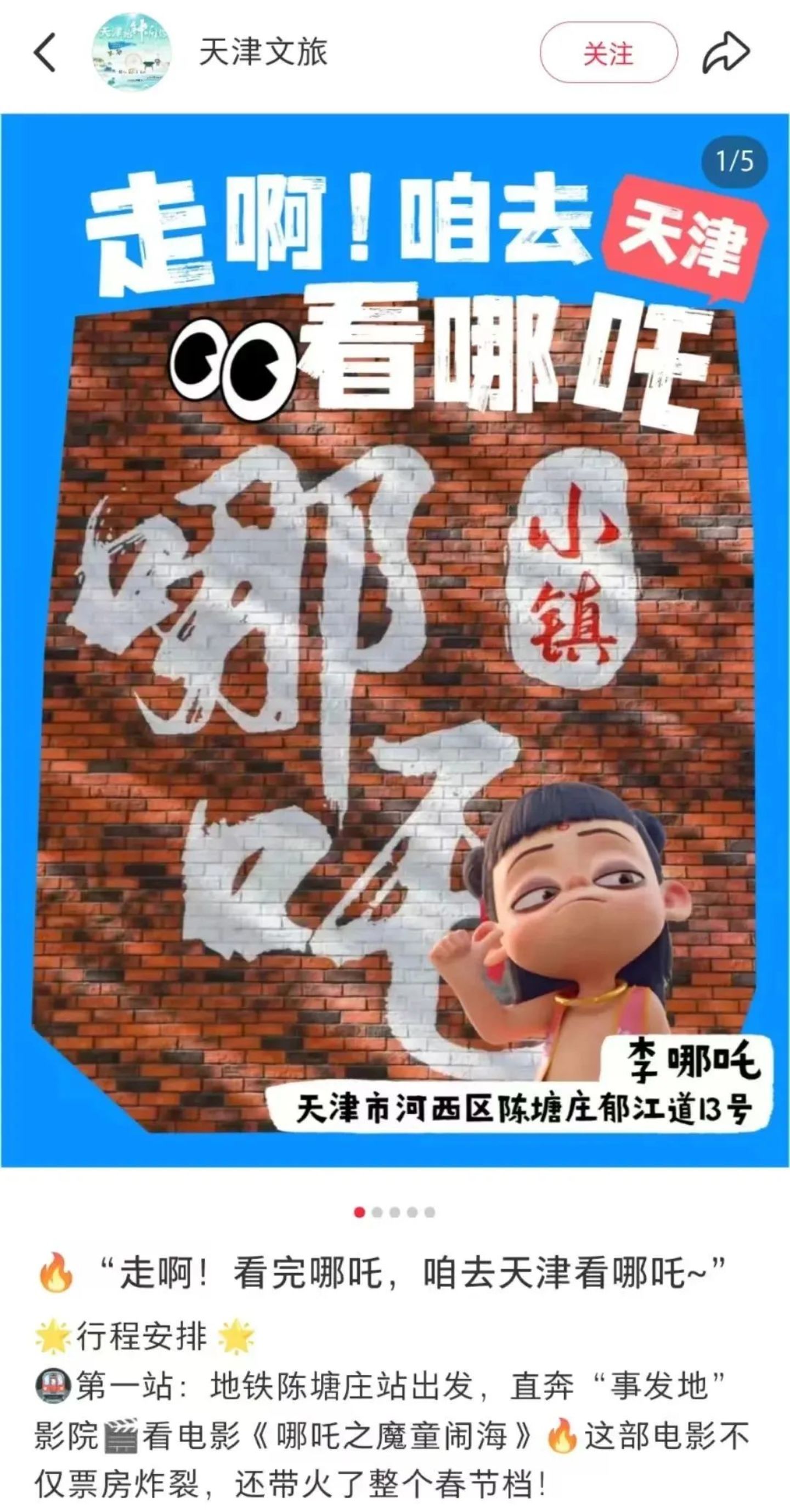 天津文旅则在小红书发布“去天津看哪吒”活动。第一站,从陈塘庄地铁站出发去影院看电影;第二站,是找一家天津菜馆,点一份干煸鱿鱼须;第三站,去哪吒小镇,跟哪吒身份证合影。