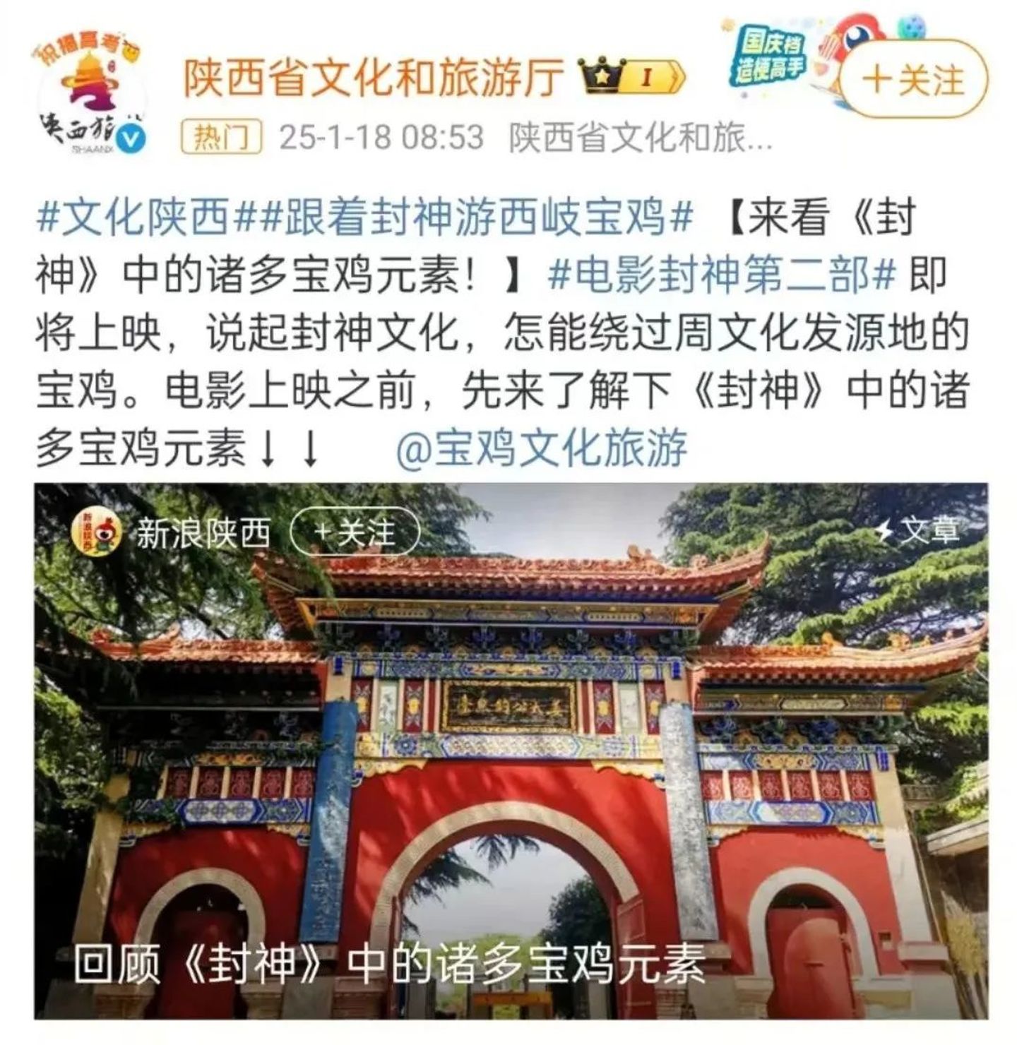 而在今年春节档,《封神2》是各地文旅押宝的代表,有不少文旅前置的动作。凭电影票根免门票或来景区打卡可抽电影票,成了“电影+文旅”的标配。《封神2》就联动多地文旅,在不少景区推出凭电影票根免门票活动。作为青岛东方影都拍摄的作品,青岛各景区如崂山风景区、青岛啤酒博物馆、青岛极地海洋公园都打了头阵。与封神文化相关的省市自然不在话下,比如曾经是西岐的陕西宝鸡、殷商古都的河南安阳、朝歌文化发源地河南鹤壁。