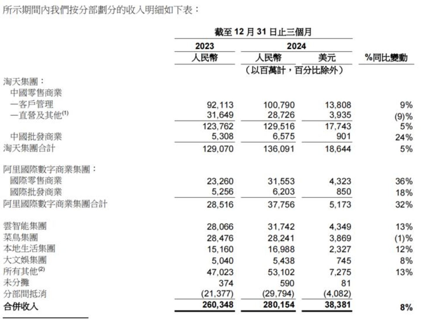 财报显示,2025年第三财季(截至2024年12月31日止季度)营收2801.5亿元人民币,同比增长8%;经营利润为人民币412.05亿元(约56.45亿美元),同比增长83%;归属于普通股股东的净利润为人民币489.45亿元(约67.05亿美元),同比增长333%。