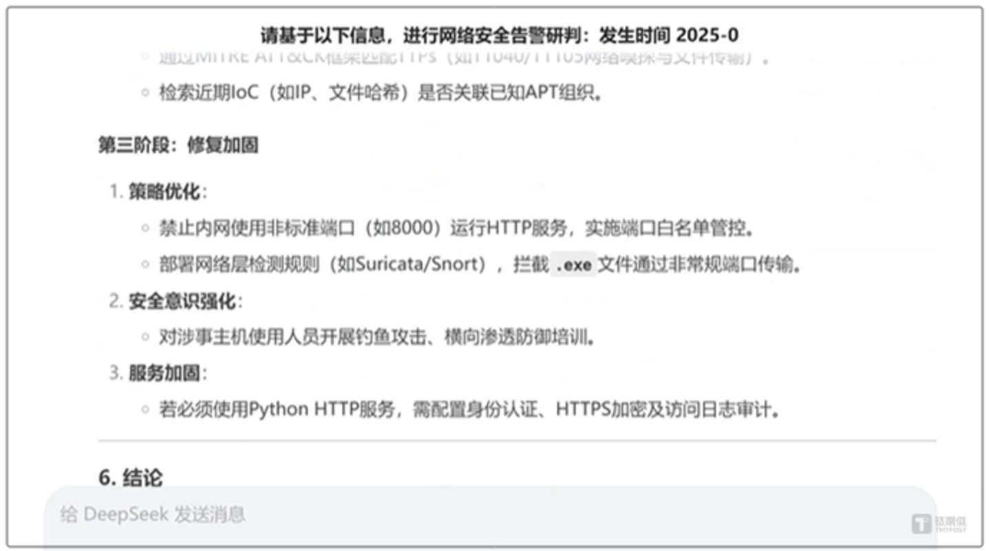 而今,DeepSeek的横空出世再次让这些大模型相形见绌——DeepSeek虽然是通用大模型,但其推理能力已经让其能进行网络安全告警研判分析: