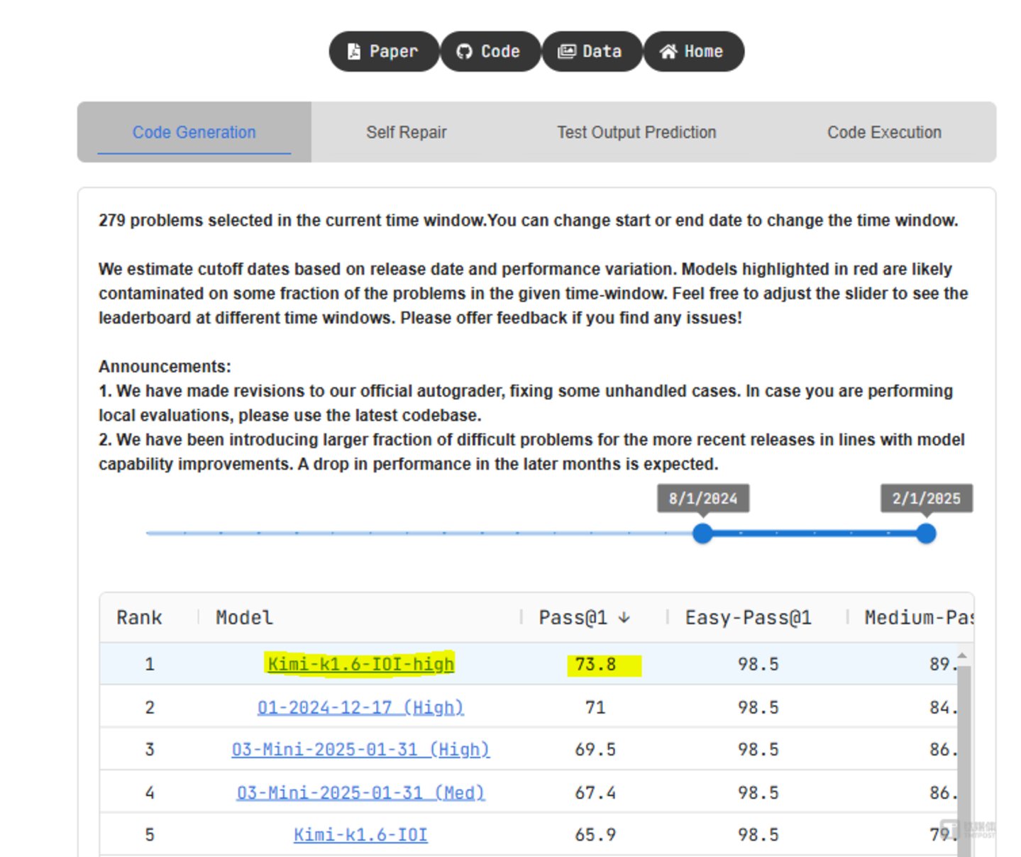 有趣的是,今天凌晨,月之暗面kimi再一次“撞车”,悄悄公布最新Kimi-K1.6-IOI-high模型,其在LiveCodeBench基准测试榜单上排名第一,超越了GPT和Claude系列模型。