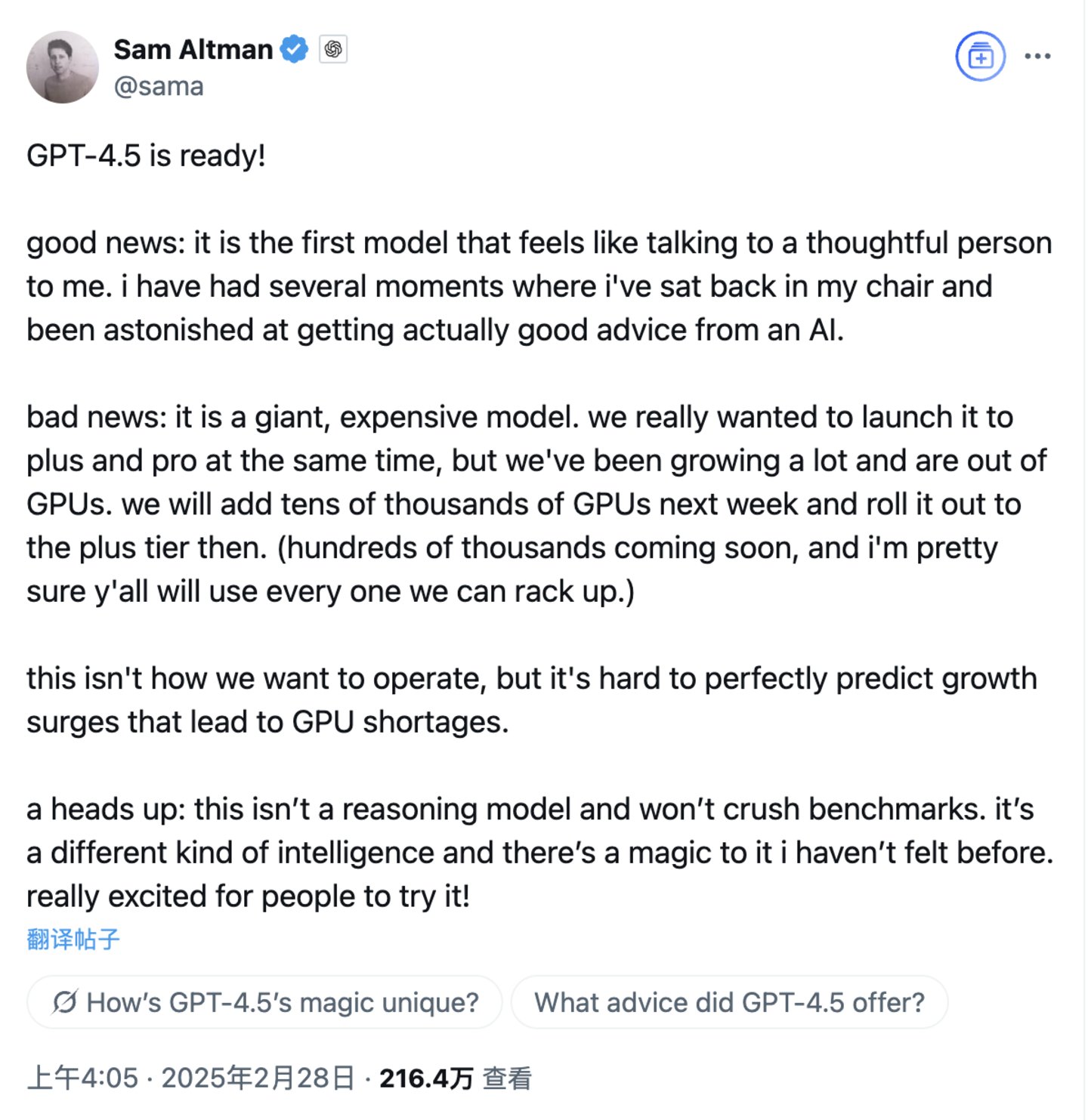 尽管OpenAI CEO奥尔特曼(Sam Altman)没现身在发布会现场,但他发推文表示,“GPT‑4.5 让他第一次感觉像在与一个有思想的人在交谈,可以从模型那里得到真正好的建议。不过坏消息是,这是一个庞大而昂贵的模型,真的很想同时推出Plus 和 pro 版本,但是我们GPU计算卡已经不够了。下周我们将添加数万张GPU卡。”