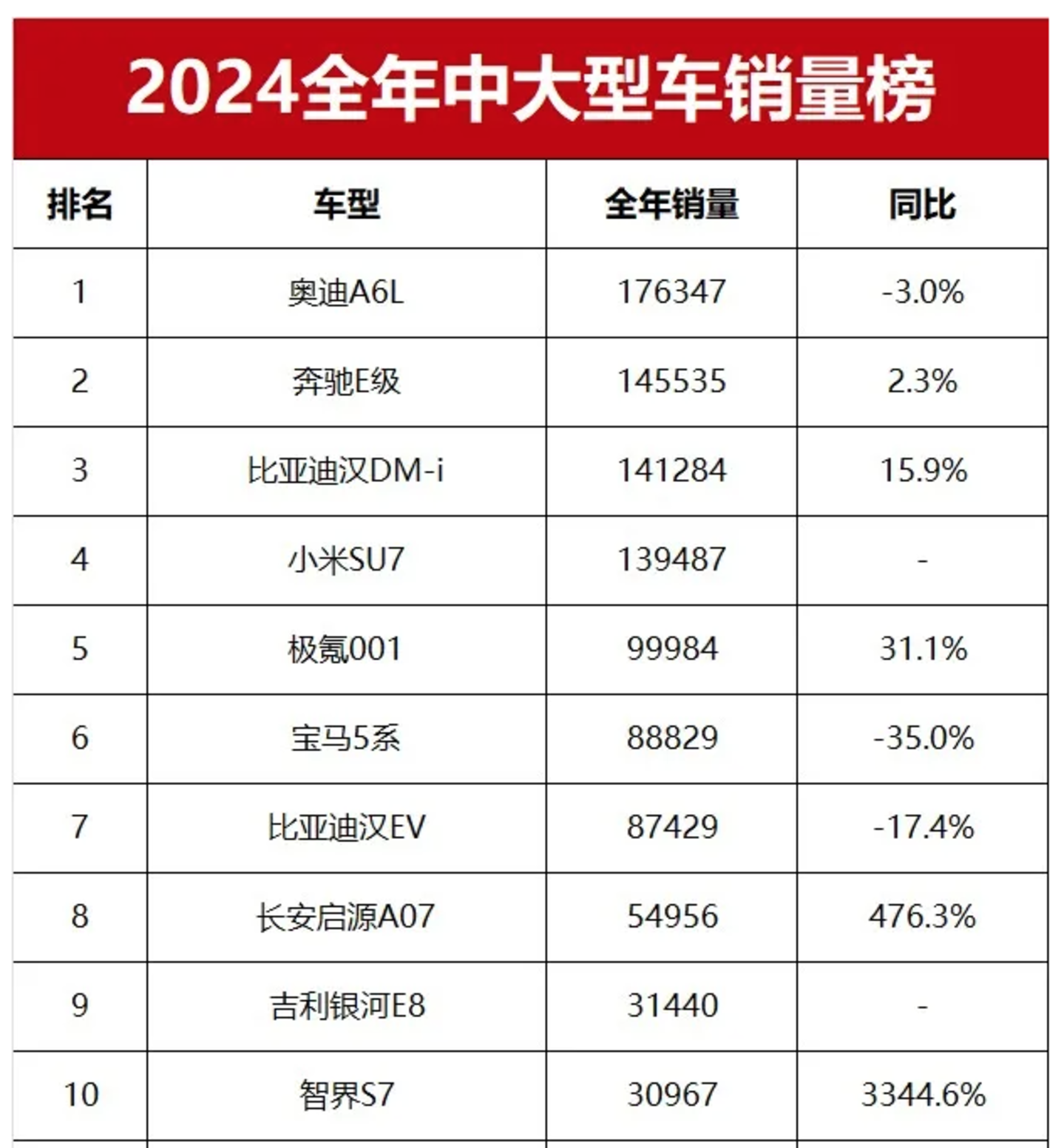 而从2024年的销量来看,BBA的56E系列整体在走下坡路。其中奥迪A6L以17.7万的销量蝉联中国豪华品牌销量冠军,但同比下降3%;奔驰E级销量超过14.5万辆,同比增长2.3%;最惨的是宝马5系,全年销量连10万辆都不到,同比暴跌35%。
