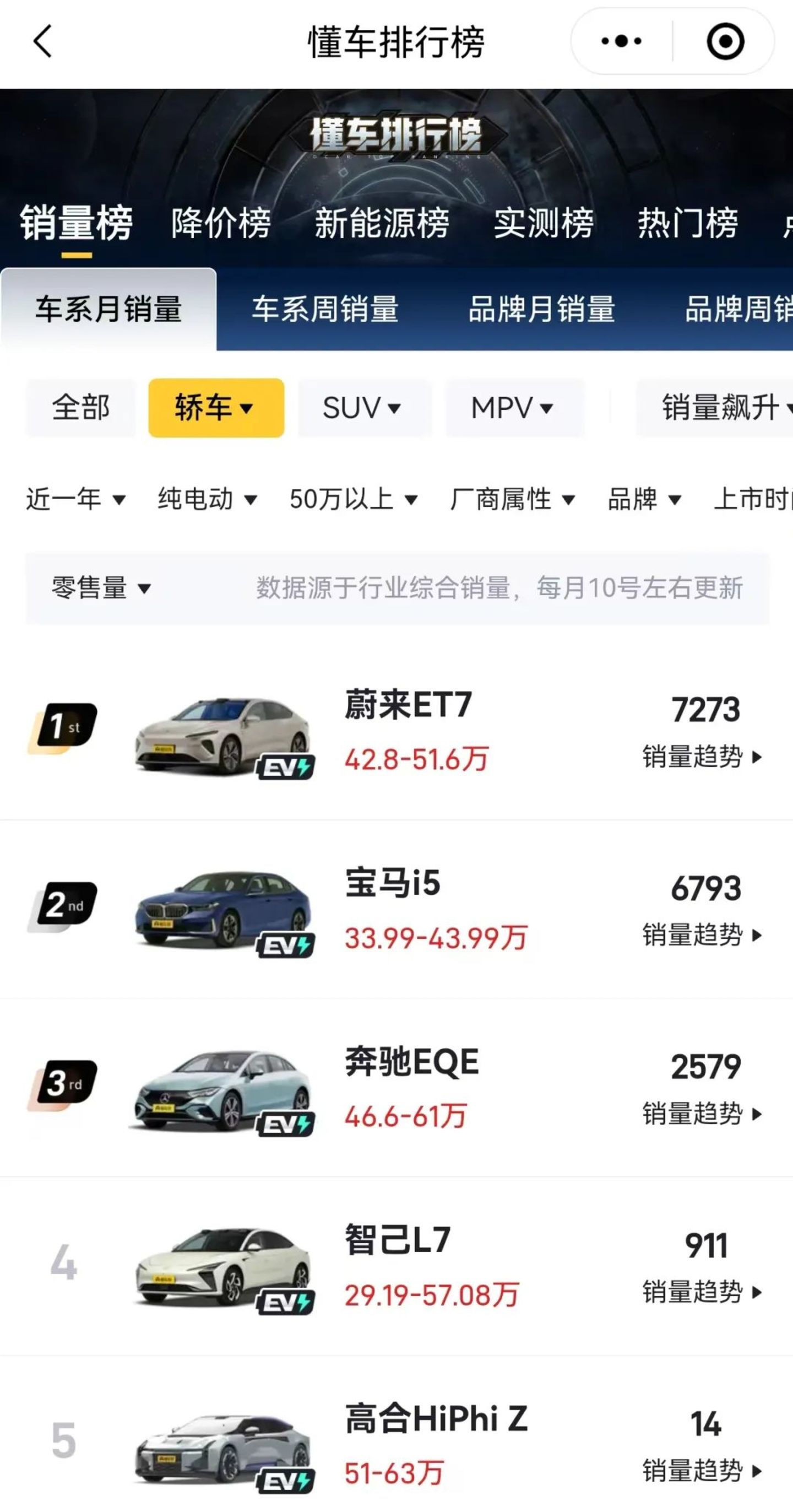 懂车帝数据显示,在过去一年里,50万以上的纯电轿车只有5款,其中销量排第一的是蔚来ET7,卖了7273台,排第二的是宝马i5,卖了6793台。请注意,这可都是一年的销量,而且蔚来ET7的起售价低至42.8万元,宝马i5则低至33.99万元。