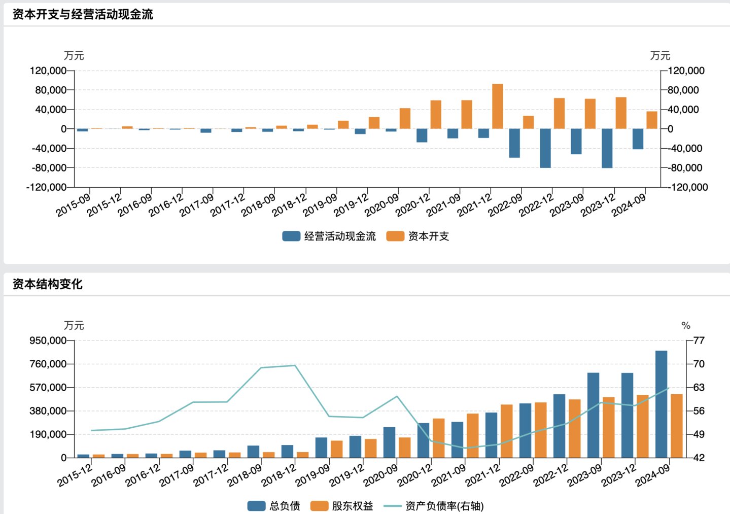 与此同时,应收账款也在大增长。2020-2023年,至纯科技应收账款分别为9.8亿元、12亿元、21.1亿元、24.1亿元,2024年三季度末,这一数据已攀升至29.3亿元。此外,公司总负债在3年时间里暴增50亿元,截至2024年第三季度末,公司资产负债率升至62.73%。