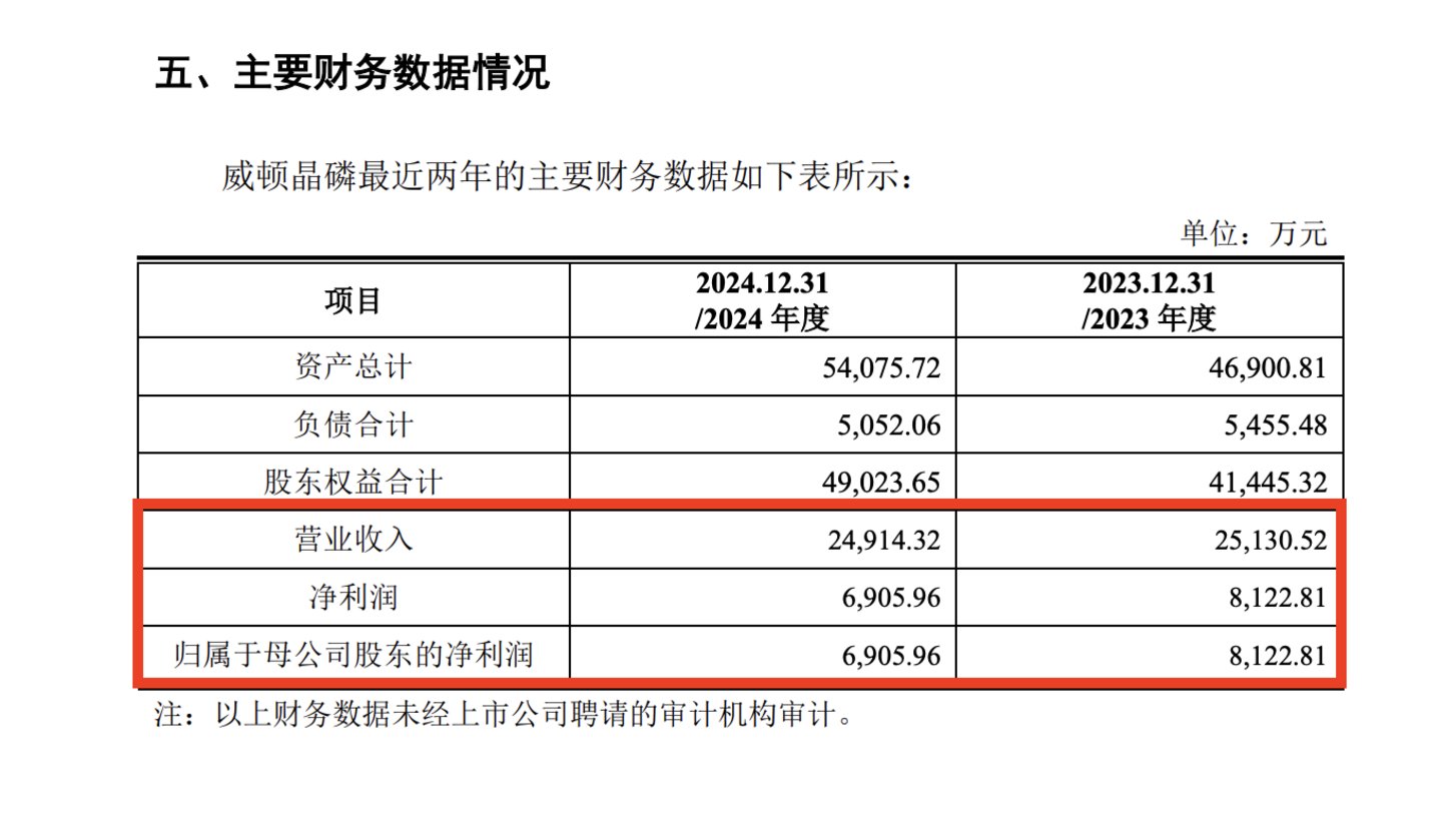 更何况,威顿晶磷2024年的业绩没有明显反转,其营收和净利润均较2023年有所下滑,净利润下滑约15%。
