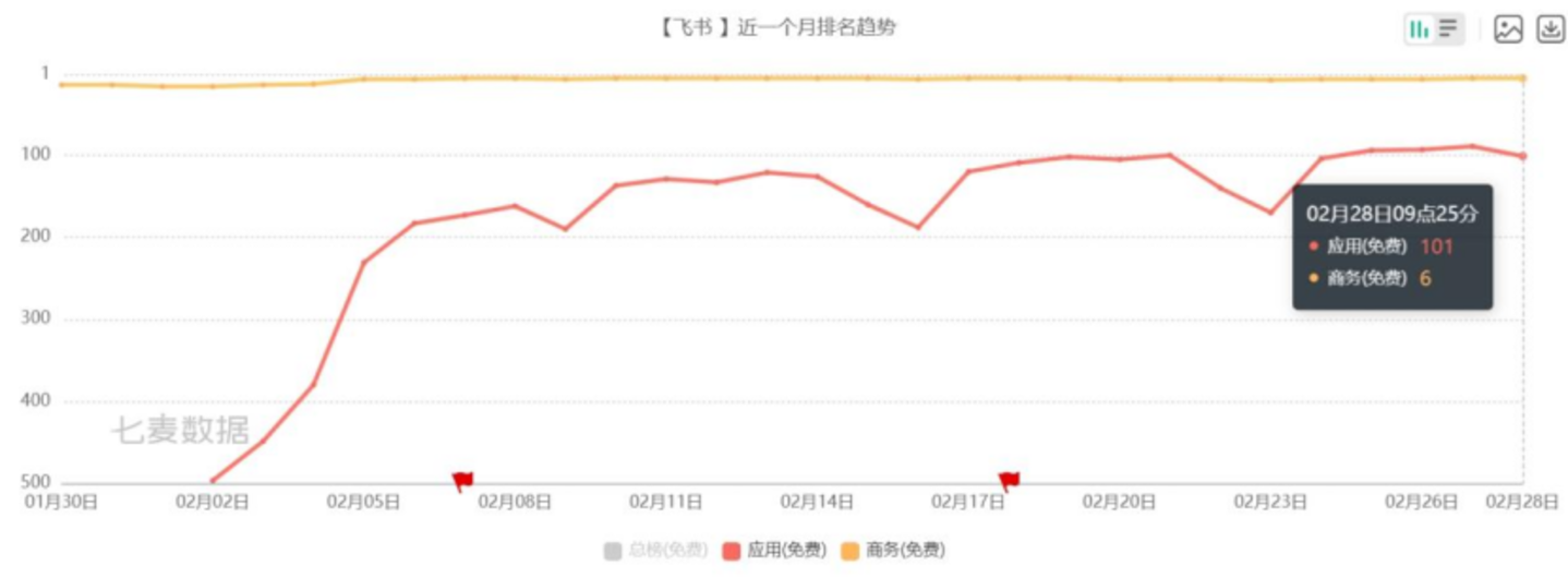 以飞书为例,根据七麦数据,2月初它在苹果App Store免费榜排在500名开外;接入DeepSeek后,2月7日拉升至200名左右。随后二十天震荡上升,如今已跻身TOP100。