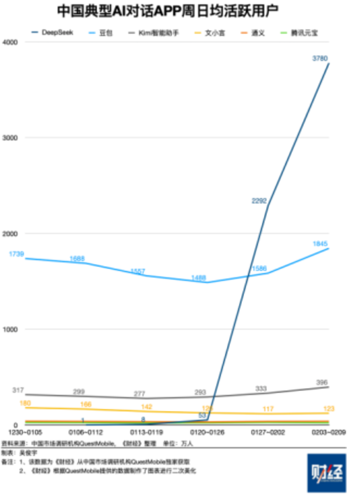 QuestMobile的数据显示,2月3日~2月9日这一周,文小言的DAU为123万,元宝仅为22万;DeepSeek高达3780万,豆包也有1845万。DeepSeek的DAU相当于文小言31倍,相当于元宝的172倍。