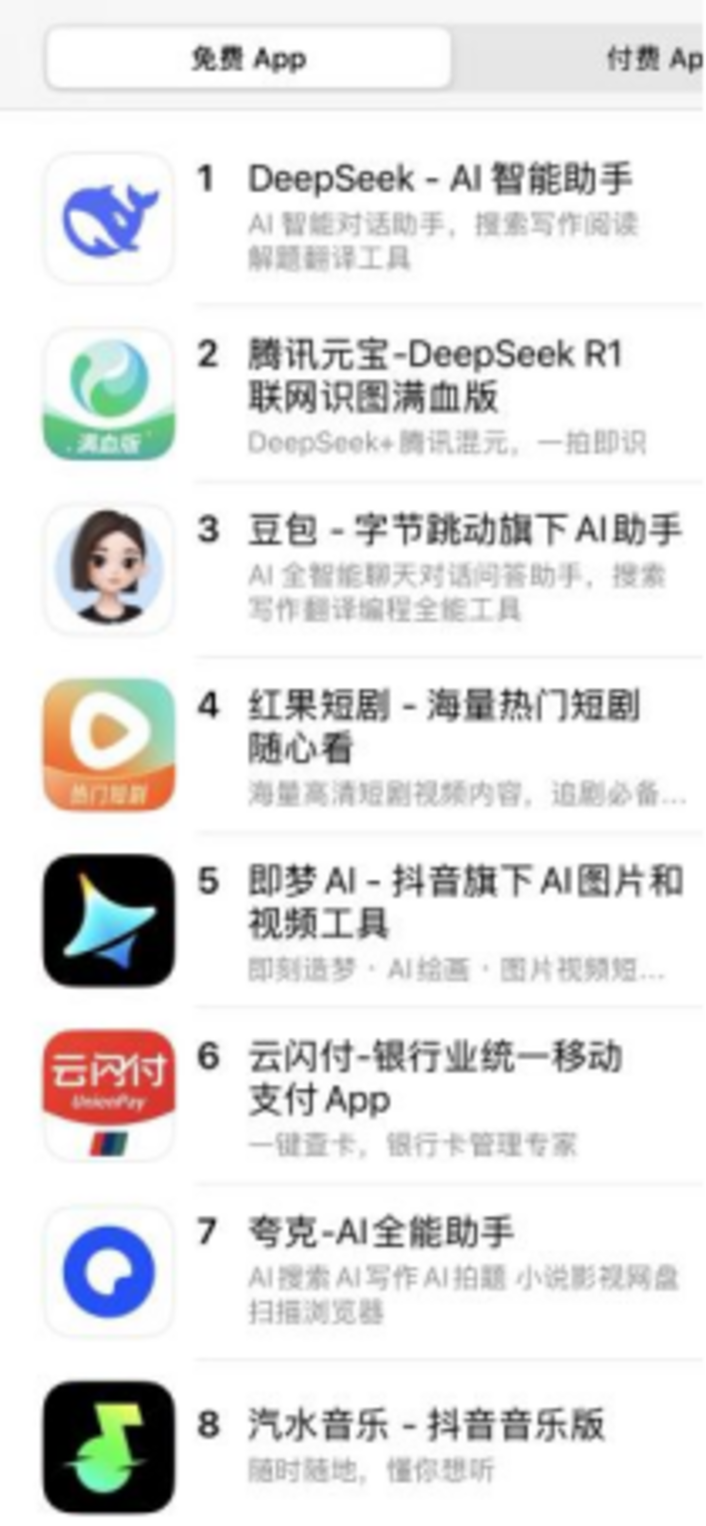 DeepSeek的粉丝们很快做出反应。2月27日,即梦冲上苹果App Store应用商店免费榜第5名,悟空浏览器则排名第10。