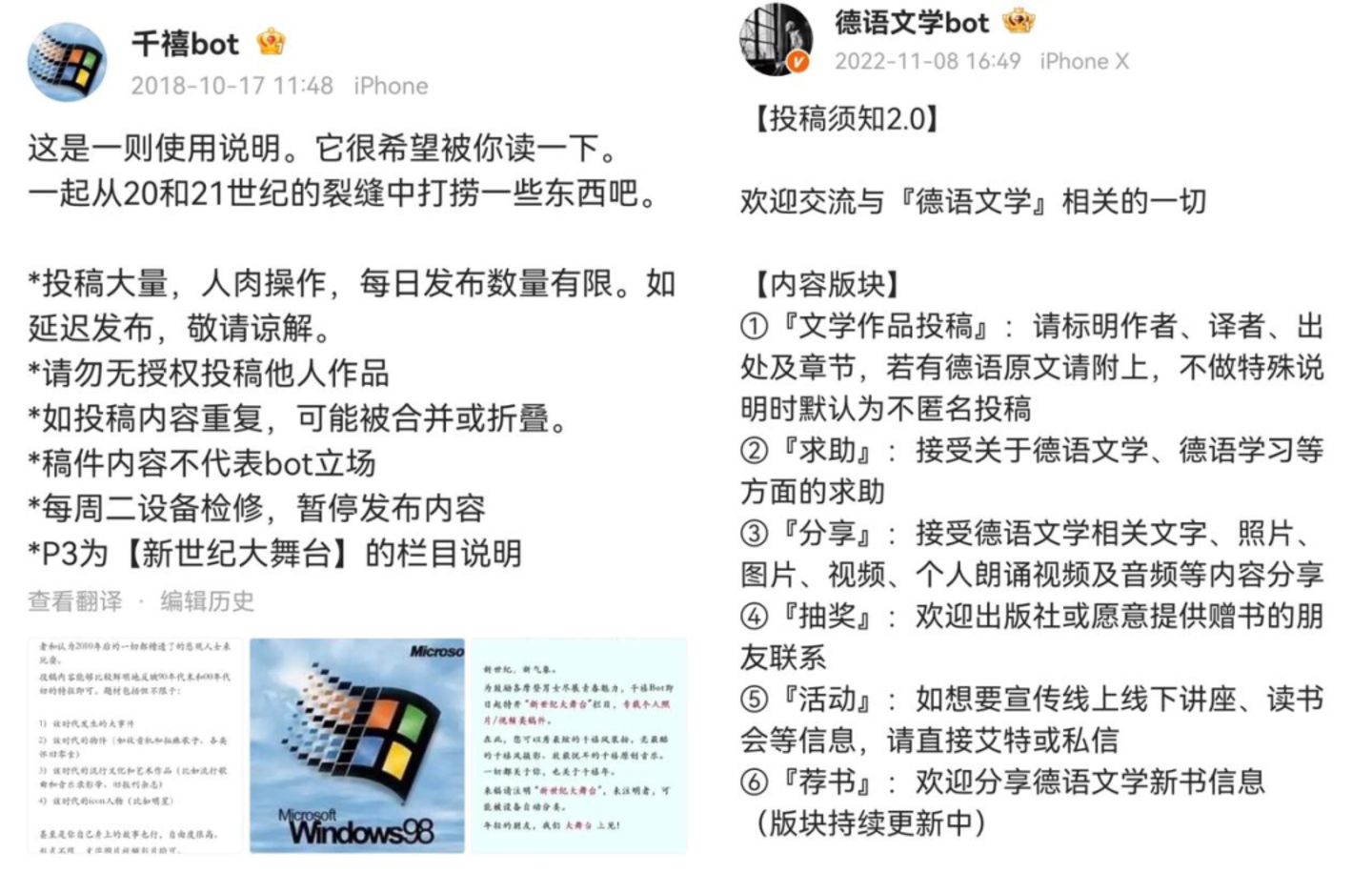 一个具体的例子是bot文化在微博的演变。早期bot是在庞大的信息流中,部分用户自发运营的信息中转站,以资源整合和二次传播为主,如英美文学bot、千禧bot都属此类,代餐bot、同人女bot等还具有一定的内容共创属性。用户向bot投稿是完全匿名和私人的行为,ID都不用留,且只要投稿人愿意,ta也无需跟浏览bot内容的其他人进行持续讨论或建立社交关系。