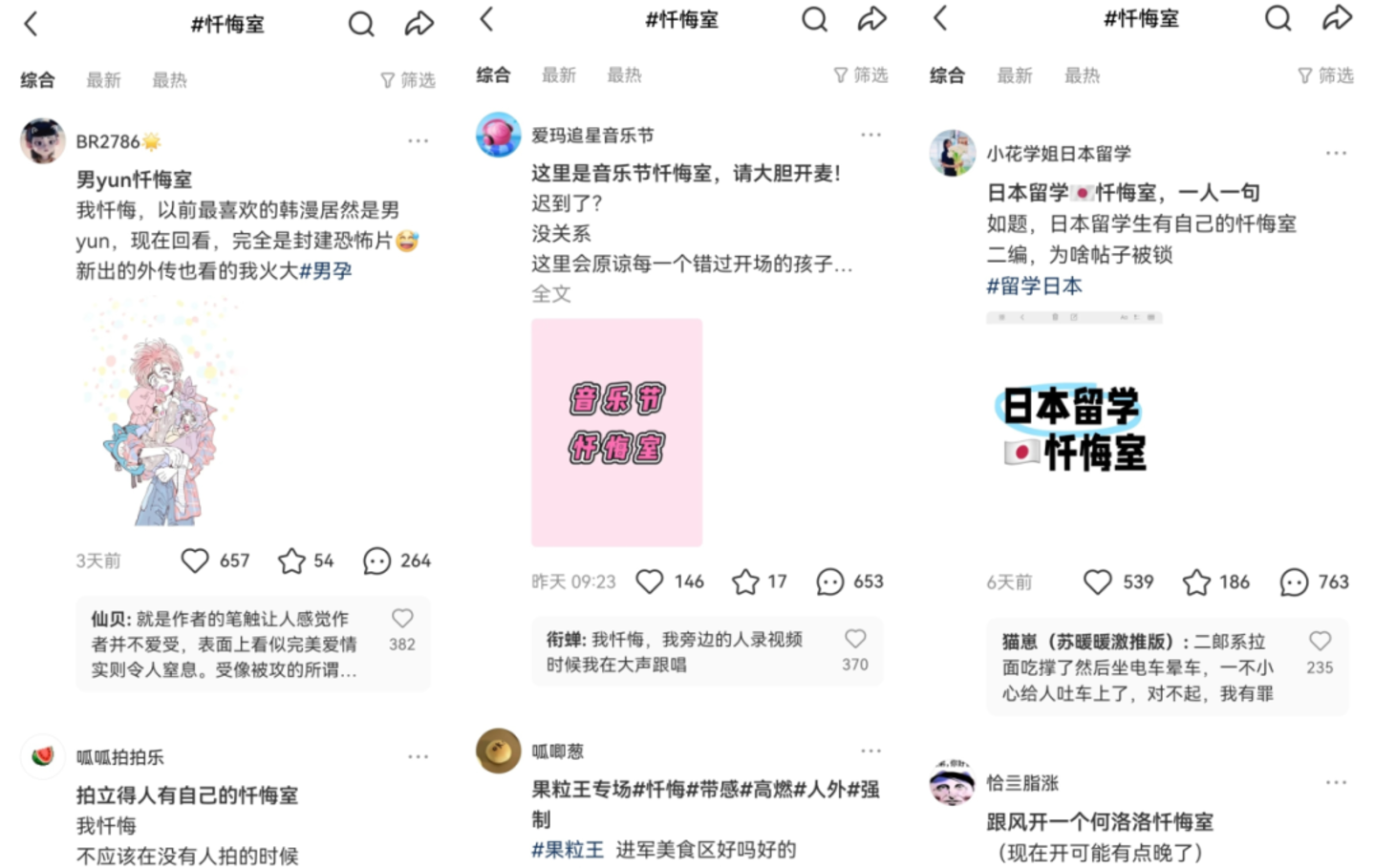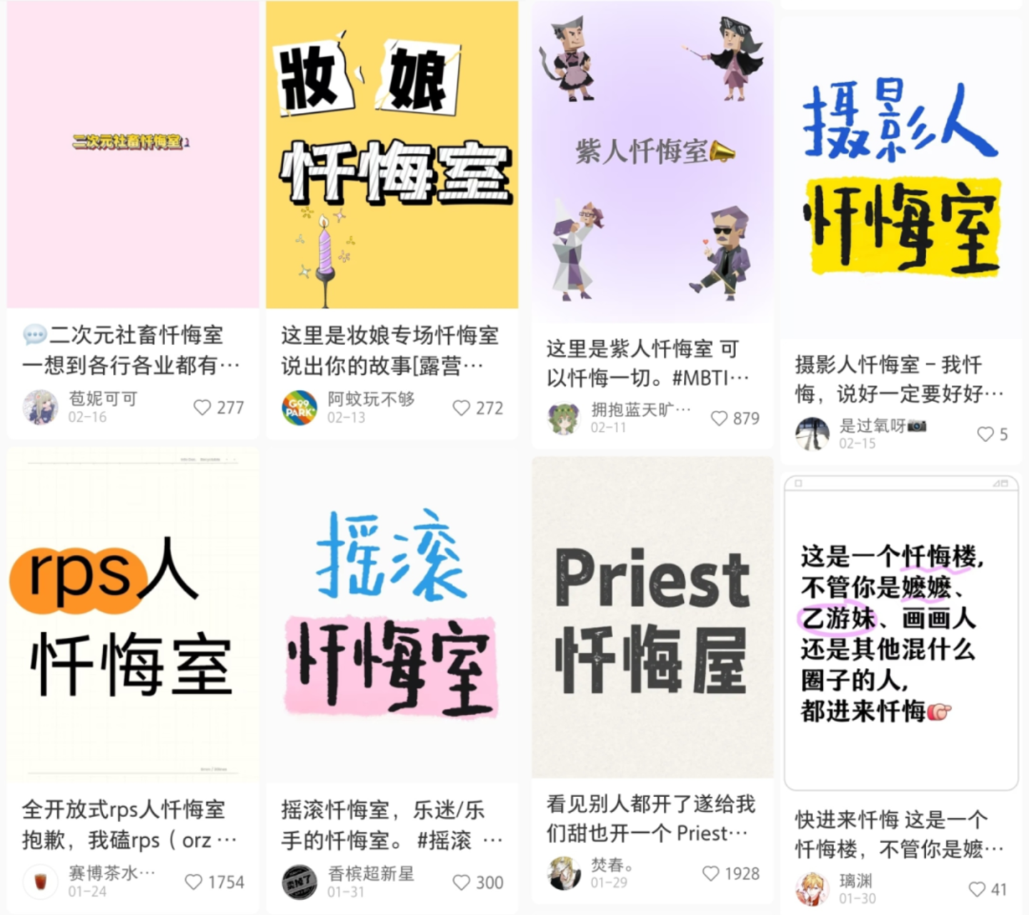 这是近期小红书上流行的一类发帖形式,划定主题,邀请大家来评论区讲述自己在这个领域做过什么需要忏悔的事。如果对小红书上忏悔室的话题进行分类,常见的忏悔对象可以是某个具体的作品或者IP,小说、游戏、动漫、综艺等等;可以是某个泛指的对象,比如小猫小狗、相机品牌;也可以是某个群体,比如同人女、秀粉、亚比、INFP、某个大学、某个职业、某国留子。