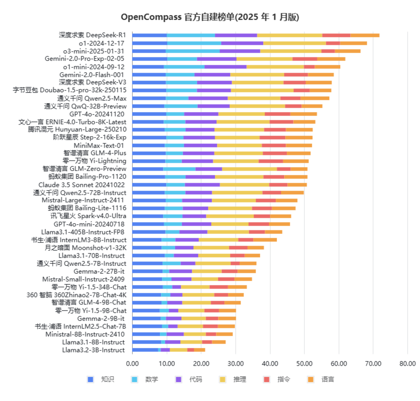 司南大模型榜单显示:文心一言与混元明显落后于DeepSeek-R1