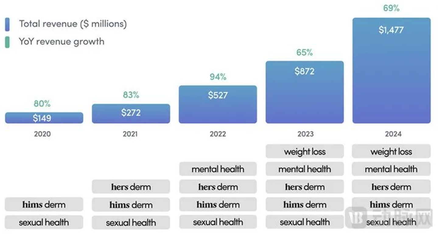 作为一家最初定位在男性性健康及脱发领域的互联网医疗新锐,Hims &Hers在近年来业务范围不断扩大,不仅切入女性健康赛道,更是陆续覆盖心理健康、肥胖等疾病领域,并正拓展睡眠、生殖健康和糖尿病等疾病领域。此外,这家企业近年来业绩表现极为突出,堪称数字医疗领域的“清流”,引发了高度关注,具有极强的参考意义。
